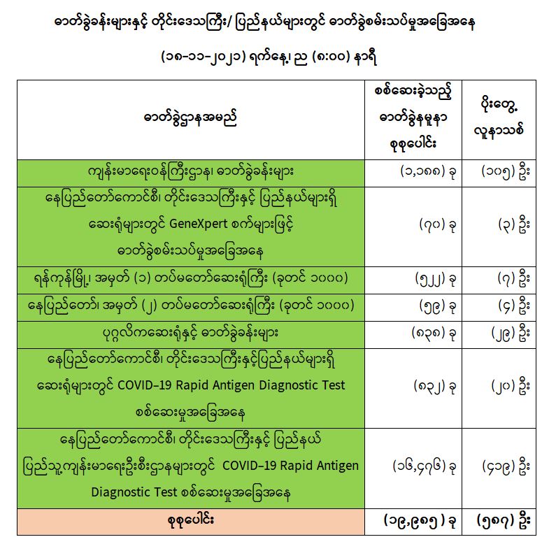 သို့ဖြစ်ပါ၍ ယနေ့အထိ ဓာတ်ခွဲနမူနာစုစုပေါင်း (၅,၃၀၄,၀၉၄) ခုအား စစ်ဆေးခဲ့ပြီး COVID-19 ဓာတ်ခွဲ အတည်ပြုလူနာ စုစုပေါင်း (၅၁၆,၁၄၆) ဦး ရှိပြီ ဖြစ်ပါသည်။