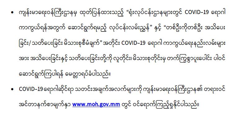 • COVID-19 ကာကွယ်ဆေးထိုးနှံမှုခံယူခြင်းတို့ကို အထူးဂရုပြု ပူးပေါင်း ဆောင်ရွက်ကြရန် လိုအပ်ပါသည်။