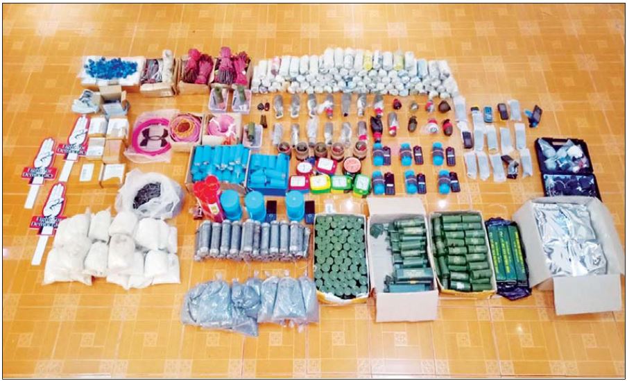 တရားခံ မောင်ကျော်(ခ)ဖြိုးဇေယျာသော် ၏ ထွက်ဆိုချက်အရ အကြမ်းဖက်သမားများ ခိုအောင်းနေထိုင်နိုင်ရေး ငှားရမ်းထားသော နေအိမ်များအား ဝင်ရောက် ရှာဖွေခဲ့ရာ လက်နက်/ ခဲယမ်းများ သိမ်းဆည်းရမိမှုအနေဖြင့် လက်နက်ငယ်မျိုးစုံ ၉၃ လက်၊ လက်လုပ်ပစ္စတို ၁၂၈ လက်၊ ကျည်အိမ်မျိုးစုံ ၂၀၆ ခု၊ ခဲယမ်းမျိုးစုံ ၁၃,၉၄၂ တောင့်၊ ၄၀ မမဗုံးသီး ၂၆ လုံး၊ ရှေ့ထွက်မိုင်း ၆ လုံး၊ လက်ပစ်ဗုံးမျိုးစုံ ၃၃ လုံး၊ လက်လုပ်မိုင်းမျိုးစုံ ၁၈၁ လုံး၊ TNT ယမ်းမျိုးစုံ ၁၆၃ တောင့်၊ C4 ယမ်း ၉ တောင့်၊ ဒီတိုနေတာ ၈၀၀ ချောင်း၊ မှန်ပြောင်း ၁ လက်၊ ဂြိုလ်တုဖုန်း ၁၃ လုံးနှင့် ဖောက်ခွဲရေး ဆက်စပ်ပစ္စည်းများအား သိမ်းဆည်းရမိခဲ့သည်။
