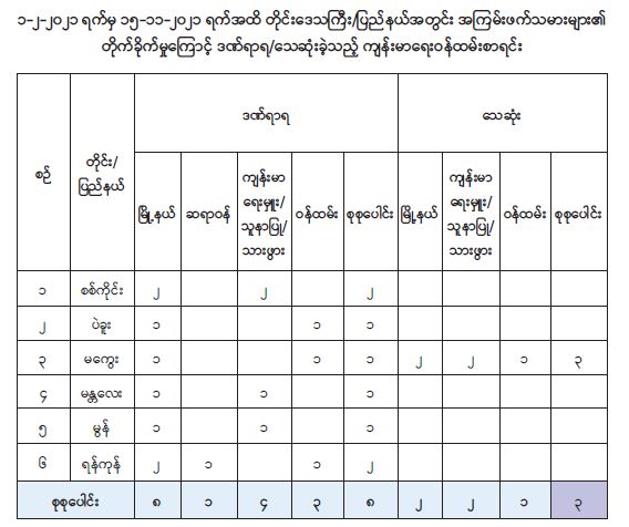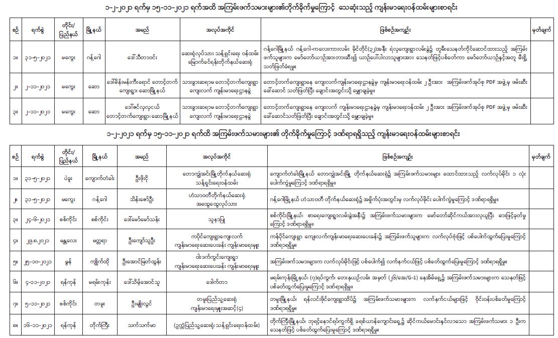 ထိုသို့ နိုင်ငံတော်နှင့် ပြည်သူများ၏ ကျန်းမာရေးကဏ္ဍ မြှင့်တင်ရေး ဆိုင်ရာများကို အစိုးရ၊ တပ်မတော်၊ ကျန်းမာရေးဝန်ထမ်းများနှင့် ပြည်သူများက ဟန်ချက်ညီညီ ပူးပေါင်းဆောင်ရွက်နေမှုများအပေါ် မလိုလား သည့် အကြမ်းဖက် အုပ်စုများဖြစ်သော CRPH ၊NUG၊ PDF စသည့်အဖွဲ့အစည်းများက နိုင်ငံ့အကျိုး တာဝန်ထမ်းဆောင်နေ သော ကျန်းမာရေးဝန်ထမ်းများကို အကြောင်းမဲ့ ရက်စက်စွာ သတ်ဖြတ်ခဲ့ခြင်း များလုပ်ဆောင်ခဲ့ခြင်းကြောင့် ၂၀၂၁ ခုနှစ်၊ ဖေဖော်ဝါရီ ၁ ရက်နေ့မှ နိုဝင်ဘာလ ၁၅ ရက်နေ့အထိ ကျန်းမာရေးဝန်ထမ်း ၃ ဦးသေဆုံးခဲ့ရပြီး ၈ ဦး ဒဏ်ရာရခဲ့မှုများကို ဖော်ပြပါအတိုင်းတွေ့ရှိရသည်-