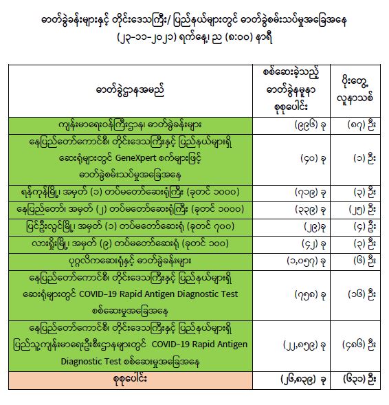 သို့ဖြစ်ပါ၍ ယနေ့အထိ ဓာတ်ခွဲနမူနာစုစုပေါင်း (၅,၄၂၂,၆၃၉) ခု အားစစ်ဆေးခဲ့ပြီး COVID-19 ဓာတ်ခွဲအတည်ပြုလူနာ စုစုပေါင်း (၅၁၉,၁၀၂) ဦး ရှိပြီဖြစ်ပါသည်။