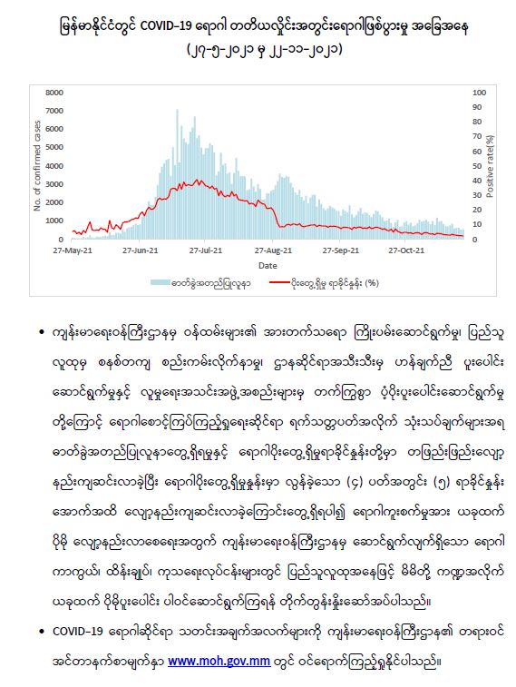 COVID-19 သံသယလူနာများ၊ ဓာတ်ခွဲအတည်ပြုလူနာနှင့် အနီးကပ်ထိတွေ့ခဲ့သူများနှင့် အသွားအလာ ကန့်သတ်ထားရှိသူများ အား COVID-19 ရောဂါ ရှိ၊ မရှိ ဓာတ်ခွဲစမ်းသပ် စစ်ဆေးခြင်းအား ပုံမှန်ဆောင်ရွက်လျက်ရှိရာ (၂၂-၁၁-၂၀၂၁) ရက်နေ့၊ ည (၈:၀၀) နာရီမှ (၂၃-၁၁-၂၀၂၁) ရက်နေ့၊ ည (၈:၀၀) နာရီအတွင်း ဓာတ်ခွဲနမူနာစုစုပေါင်း (၂၆,၈၃၉) ခုအား စစ်ဆေးပြီးစီးခဲ့ရာ COVID-19 ရောဂါ ဓာတ်ခွဲအတည်ပြုလူနာသစ် (၆၃၁) ဦး တွေ့ရှိရပါသည်။