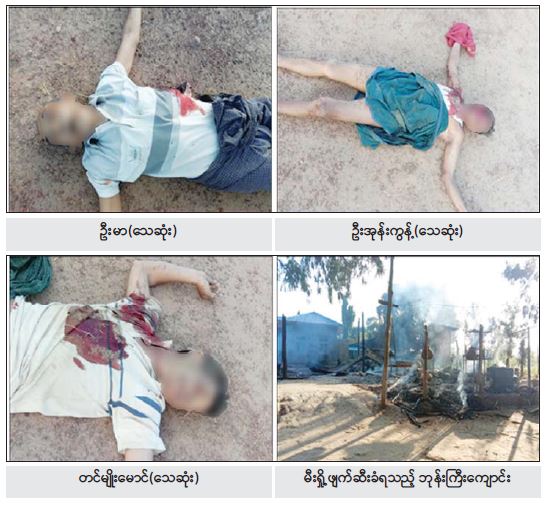 ထိုသို့ ကျေးရွာသားများ၏ ရှောင်တိမ်းနေထိုင်ခြင်းအား လက်ခံစောင့်ရှောက်ထားရှိသည့် ရွာသစ်ကုန်း ဘုန်းကြီးကျောင်းဝင်းအတွင်းသို့ PDF အကြမ်းဖက်သမား အင်အား ၅၀ ဦးခန့်က နိုဝင်ဘာလ ၂၅ ရက်နေ့ မွန်းလွဲ ၂ နာရီ ၂၀ မိနစ်အချိန်တွင် သေနတ်၊ ဓားများ ကိုယ်စီကိုင်ဆောင်ကာ ရောက်ရှိလာပြီး အဆိုပါဘုန်းကြီးကျောင်းဝင်းအတွင်းရှိ ရှောင်တိမ်းနေ ထိုင်သူများအနက် အချို့အား သတ်ဖြတ်ကာ ဘုန်းကြီးကျောင်းအား မီးရှို့ဖျက်ဆီးသွားကြောင်း သတင်းအရ လုံခြုံရေးတပ်ဖွဲ့ဝင်များ ပါဝင်သော ပူးပေါင်းအဖွဲ့က သွားရောက်စစ်ဆေးခဲ့ရာ ရွာသစ်ကုန်း ဘုန်းကြီးကျောင်းဆောင် တစ်လုံးနှင့် ပစ္စည်းထားသိုသည့် စတိုခန်းတစ်လုံးတို့ မီးလောင်ပျက်စီးခဲ့ပြီး ဘုန်းကြီးကျောင်းအတွင်း ရှောင်တိမ်း နေထိုင်လျက်ရှိသည့် အဆိုပါကျေးရွာ နေသူများဖြစ်သည့် ဦးကုလား(ခ)ဦးတင်မျိုးမောင်(၃၇)နှစ် (ဘ) ဦးကျောက်အုန်းတွင် ရင်ညွန့်ထိုးသွင်းဒဏ်ရာတစ်ချက်၊ ဦးအုန်းကွန့်(၆၅)နှစ် (ဘ)ဦးမင်းမောင်တွင် လည်ဂုတ်ပြတ်ရှဒဏ်ရာ ၂ ချက်၊ ဝဲလက်ချောင်းများ ပြတ်ရှဒဏ်ရာများ၊ ဦးမာ(၇၀)နှစ် (ဘ)ဦးပုတွင် ရင်ညွန့် ကျည်ထိမှန်ဒဏ်ရာတစ်ချက်တို့ ရရှိကာ သေဆုံးနေသည်ကို တွေ့ရှိခဲ့ရသည်။