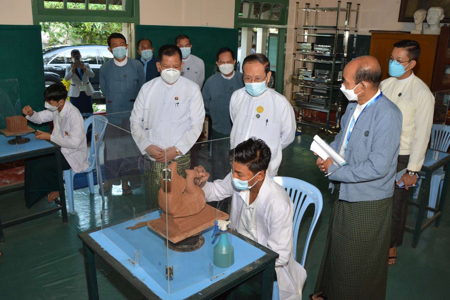 သာသနာရေးနှင့်ယဉ်ကျေးမှုဝန်ကြီးဌာန ပြည်ထောင်စုဝန်ကြီးနှင့် မန္တလေးတိုင်းဒေသကြီး အစိုးရအဖွဲ့ ဝန်ကြီးချုပ်တို့သည် နံနက် ၈ နာရီက မန္တလေးမြို့ အောင်မြေသာစံမြို့နယ်ရှိ အနုပညာဦးစီးဌာနသို့ရောက်ရှိပြီး အနုပညာအထက်တန်းကျောင်း ပန်တျာ၊ ပန်းချီ ပန်းပု ဌာနရှိ ကျောင်းသားများ၏ လက်တွေ့ပညာသင်ကြားနေမှုများကို ကြည့်ရှုစစ်ဆေး၍ ထုတ်လုပ် ဌာနစုရှိ လေ့ကျင့်ရေး ဇာတ်ရုံ၌ အနုပညာအထက်တန်းကျောင်း(မန္တလေး)မှ ကျောင်းသား၊ ကျောင်းသူများ၏ စွမ်းရည်ပြတင်ဆက်မှုနှင့် ထုတ်လုပ်ဌာနစု (မန္တလေး)မှ အနုပညာရှင် ဝန်ထမ်းများ၏ ဖျော်ဖြေတင်ဆက်မှုများကို ကြည့်ရှုအားပေးကာ ပြည်ထောင်စုဝန်ကြီးက အနု ပညာ အထက်တန်းကျောင်း (မန္တလေး)မှ ကျောင်းသား၊ ကျောင်းသူလေးများကို အားပေး စကားပြောကြားသည်။