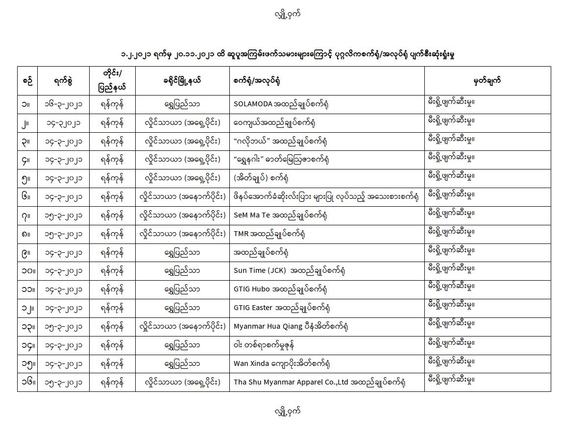 ထိုသို့ အကြမ်းဖက်အဖွဲ့များ၏ အကြောင်းမဲ့ မိုင်းထောင်ဖောက်ခွဲ၊ မီးရှို့ ဖျက်ဆီးခြင်း စသည့် အကြမ်း ဖက်လုပ်ရပ်များ လုပ်ဆောင်ခဲ့ခြင်းကြောင့် ၂၀၂၁ ခုနှစ် ဖေဖော်ဝါရီ ၁ ရက်မှ နိုဝင်ဘာ ၂၀ ရက်အထိ စက်ရုံ၊ အလုပ်ရုံ ၂၃ ခုတို့ ပျက်စီးဆုံးရှုံးခဲ့ရမှုကို ဖော်ပြပါအတိုင်း တွေ့ရှိရသည်-