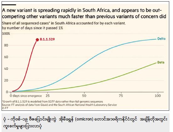 ဖော်ပြပါပုံမှာ အိုမီခရွန် (omicron) (B.1.1.529) ဗိုင်းရပ်စ်မျိုးကွဲဟာ ဒယ်လ်တာနဲ့ ဘီတာဗိုင်းရပ်စ် မျိုးကွဲတွေနဲ့နှိုင်းယှဉ်ရင် အချိန်တိုအတွင်းမှာ ကူးစက်ခံရသူရာခိုင်နှုန်း အရေအတွက်ဟာ လျင်မြန် စွာ များပြားလာတာကို တွေ့ရနိုင်ပါတယ်။