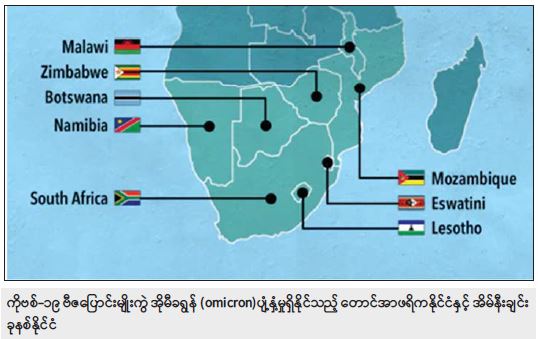 ဖြေ။ ကိုဗစ်-၁၉ ဗီဇပြောင်းမျိုးကွဲ အိုမီခရွန် (omicron) (B.1.1.529) စတင်ရာအဖြစ် အာဖရိကတိုက်၊ တောင်အာဖရိကနိုင်ငံနဲ့ ဘော့ဆွာ နာနိုင်ငံလို့ ကနဦး သိထားရပါတယ်။ စတင် အတည်ပြု တွေ့ရှိရခြင်းအနေနဲ့ နိုဝင်ဘာ ၉ ရက် မှာ တောင်အာဖရိကနိုင်ငံက ရရှိတဲ့ ဓာတ်ခွဲနမူနာ တစ်ခုမှာ တွေ့ခဲ့ရတာ ဖြစ်ပြီး ဒီလိုတွေ့ရှိရမှုကို တောင်အာဖရိကနိုင်ငံက နိုဝင်ဘာ ၂၄ ရက်မှာ ကမ္ဘာ့ကျန်းမာရေး အဖွဲ့ကို သတင်းပေးပို့ခဲ့တာ ဖြစ်တယ်လို့ သိရှိရပါတယ်။ အိုမီခရွန် (omicron) (B.1.1.529) အဖြစ် စတင် တွေ့ရှိအတည်ပြုပြီး (၃၀-၁၁-၂၀၂၁) ရက်နေ့အထိ တောင်အာဖရိက၊ ဘော့ဆွာနာ၊ နယ်သာလန်၊ ပေါ်တူဂီ၊ ယူကေ၊ ဩစတြေးလျ၊ ဂျာမနီ၊ အီတလီ၊ ဟောင်ကောင်၊ ကနေဒါ၊ အစ္စရေး၊ ဒိန်းမတ်၊ ဩစတြီးယား၊ ဆွီဒင်၊ ဘယ်လ်ဂျီယံ၊ ချက်၊ စပိန် တို့ပါဝင်တဲ့ ကမ္ဘာတစ်ဝန်း နိုင်ငံဒေသပေါင်း ၁၇ ခုကို ပျံ့နှံ့ရောက်ရှိနေတာကို အတည်ပြုပြီး ဖြစ်တယ် လို့ သိရပါတယ်။ ဒါ့အပြင် ပြင်သစ်၊ ဖင်လန်၊ ဂျပန်၊ ဆွစ်ဇာလန်စတဲ့ နိုင်ငံတွေကိုလည်း ရောက်ရှိနေနိုင် ဖွယ်ရှိပြီး ကမ္ဘာတစ်ဝန်း အတည်ပြုလူနာ ၁၉၉ ဦးနဲ့ သံသယဖြစ်ဖွယ်လူနာ ၁၃၀၂ဦးအထိ ရှိနေပြီ ဖြစ်ပါ တယ်။ မေး။ အိုမီခရွန် (omicron) (B.1,1,529) မှာ မျိုးဗီဇ ပြောင်းလဲမှုတွေ များနေတာတွေကနေ ဘယ်လိုနောက်ဆက် တွဲဆိုးကျိုးတွေ ဖြစ်လာနိုင်ပါ သလဲ။ ဖြေ။ ဒီလိုဗီဇပြောင်းတာတွေများတဲ့ ကိုဗစ်-၁၉ ရောဂါပိုးအနေနဲ့ ကတော့ မူလ ကိုဗစ်-၁၉ ပိုးရဲ့ ရောဂါကူးစက်ပြန့်ပွား ဖြစ်ပွားစေတဲ့ ပြုမူပုံတွေနဲ့ လုံးဝမတူနိုင်တော့ တာဖြစ်ပါတယ်။ လတ်တလောမှာ သူ့ရဲ့ နောက်ဆက်တွဲဆိုးကျိုးတွေကို ဆက်လက် စောင့်ကြည့်လျက်ရှိပြီး ဖြစ်နိုင်ခြေရှိတဲ့ နောက်ဆက် တွဲဆိုးကျိုးတွေအနေနဲ့ ဆူးချွန်မှာပါရှိတဲ့ ခုခံအား စနစ်အရ အရေးပါတဲ့နေရာတွေမှာ ပြောင်းလဲမှုတွေ ဖြစ်ခြင်းကြောင့် ကာကွယ်ဆေးတွေရဲ့ ထိရောက်မှုကိုလျော့ကျနိုင်စေခြင်း၊ ကိုဗစ်-၁၉ ရောဂါ ဖြစ်ပွားပြီး သူများတွင်လည်း ရောဂါထပ်မံ၍ ဖြစ်ပွားစေနိုင်ခြင်း နှင့် လူလုပ်ပဋိပစ္စည်း (therapeutic monoclonal antibodies) တွေရဲ့ ထိရောက်မှုကိုလည်း လျော့ကျ စေနိုင်ပါတယ်။