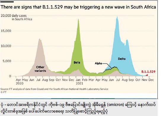 ဖြေ။ လက်ရှိတောင်အာဖရိကနိုင်ငံရဲ့ အခြေအနေ ကိုကြည့်ရရင် ကိုဗစ်-၁၉ ရောဂါကူးစက်မှု တွေဟာ မျိုးဗီဇပြောင်းလဲတဲ့ပိုးတွေ ဝင်ရောက် ကူးစက်ဖြစ်ပွားမှုနဲ့အတူ ရောဂါဖြစ်ပွားမှုတွေကို လှိုင်းအသွင် တွေ့မြင်ရတာဖြစ်ပြီး ပူးတွဲပါပုံမှာ အိုမီ ခရွန် (omicron) ဝင်ရောက်လာမှုနဲ့အတူ လှိုင်း တစ်လှိုင်းအသစ် ဖြစ်ပွားလာနိုင်မှုရဲ့အစ အသွင် ဖြစ်နေတာမို့ သတိကြီးစွာထားပြီး စောင့်ကြည့်ရမယ့် အနေအထား ဖြစ်ပါတယ်။