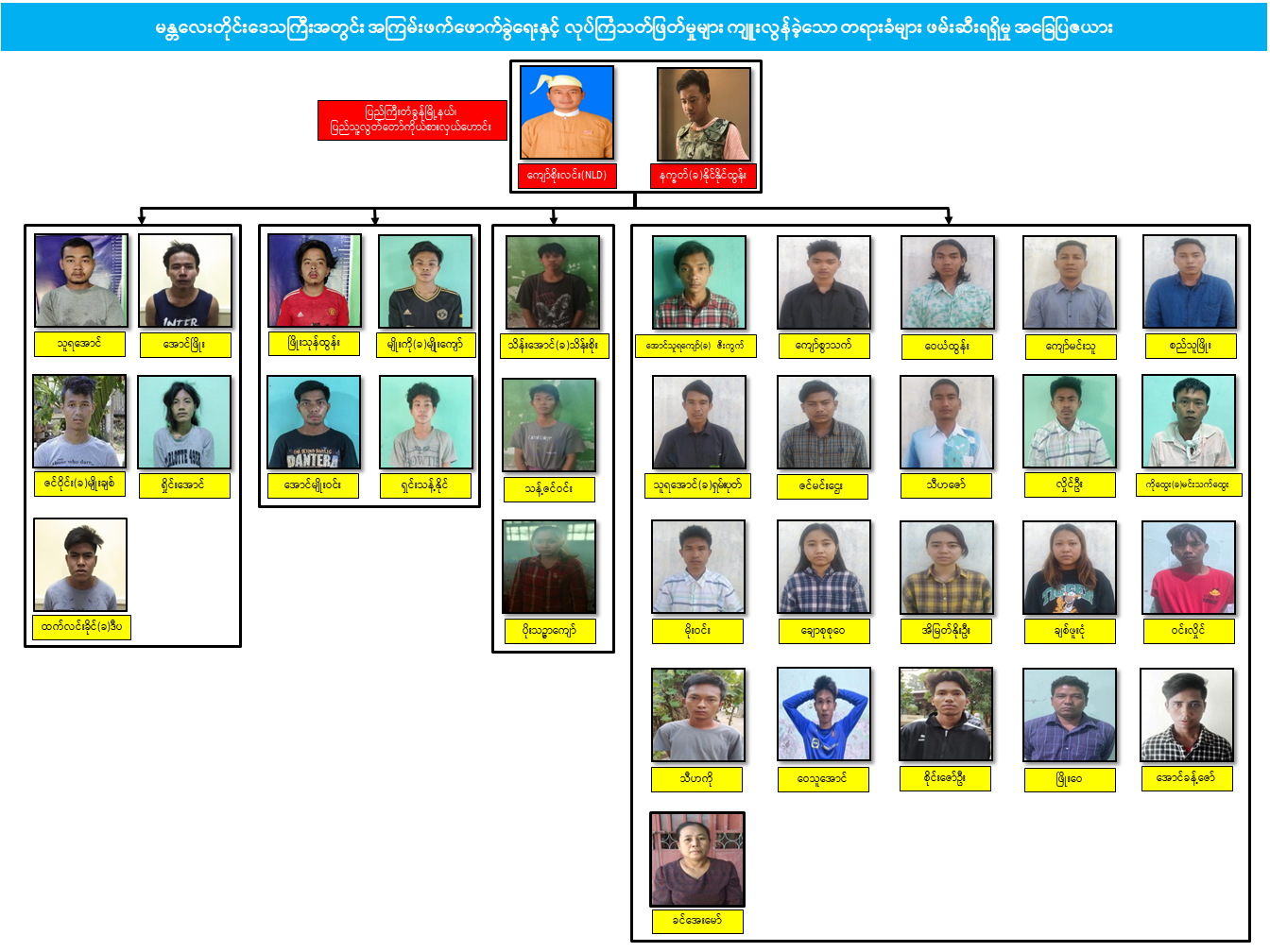 တရားခံများ၏ ထွက်ဆိုချက်အရ သူရအောင်၊ ဇင်ဝိုင်း(ခ)မျိုးချစ် တို့သည် KIA တပ်မဟာ(၈)တွင် လည်းကောင်း၊ ထက်လင်းခိုင်(ခ)ဒီပ သည် KIA တပ်မဟာ(၃)တွင် လည်းကောင်း၊ အကြမ်းဖက်သင်တန်းများ တက်ရောက်ခဲ့ပြီး ကျန်ဖမ်းဆီးရမိ တရားခံ များသည် PDF အကြမ်းဖက် ဆင့်ပွားသင်တန်းများ တက်ရောက်ပြီးသူများဖြစ်ကြောင်း ဖော်ထုတ်သိရှိရသည်။