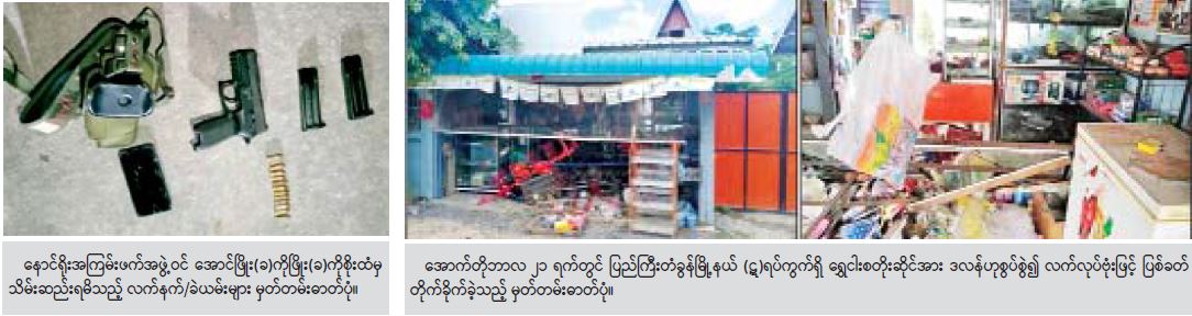 နိုင်ငံတော်တည်ငြိမ်အေးချမ်းမှုကို ပျက်ပြားထိခိုက်စေရန် ရည်ရွယ်၍ အများပြည်သူနှင့် သက်ဆိုင်သောနေရာများတွင် မိုင်းထောင်ဖောက်ခွဲခြင်း၊ နိုင်ငံတော်၏ အုပ်ချုပ်မှုယန္တရား ပျက်ပြားစေရန်အတွက် နိုင်ငံ့ဝန်ထမ်းများအား လုပ်ကြံသတ်ဖြတ်ခြင်းများအား PDF အကြမ်းဖက်အဖွဲ့များမှ ဆောင်ရွက်လျက်ရှိရာ ၂၀၂၁ ခုနှစ်၊ နိုဝင်ဘာလ ၃ ရက်တွင် KIA သောင်းကျန်းသူ တပ်မဟာ(၈)တွင် PDF အကြမ်းဖက်သင်တန်း တက်ရောက်ခဲ့သော သူရအောင် (၂၈)နှစ်အား အမရပူရမြို့နယ်၊ ကျောက်စိမ်း ဘုရားအနီးတွင် လည်းကောင်း၊ အောင်ဖြိုး(၂၆)နှစ်အား ပစ္စတို ၁ လက်၊ ကျည်အိမ် ၂ ခု ကျည် ၁၆ တောင့်နှင့်အတူ ချမ်းမြသာစည်မြို့နယ်၊ ၄၉ လမ်းနှင့် ၁၀၉ လမ်းထောင့်တွင် လည်းကောင်း ဖမ်းဆီးရမိခဲ့ပြီး ၎င်းတို့၏ ထွက်ဆိုချက်အရ ဇင်ဝိုင်း(ခ) မျိုးချစ်(၂၈)နှစ် အား လက်လုပ်သေနတ် ၁ လက်၊ ကျည် ၃ တောင့်၊ လက်လုပ်မိုင်း ၂ လုံး တို့နှင့်အတူ အမရပူရမြို့နယ်၊ ဆေးအိုးဘိုအဝိုင်းအနီးတွင် လည်းကောင်း၊ ရှိုင်းအောင်(၂၁)နှစ်အား ပြည်ကြီးတံခွန်မြို့နယ်၊ တံခွန်တိုင်အဝိုင်း အနီးတွင် လည်းကောင်း၊ ထက်လင်းခိုင်(ခ)ဒီပ (၂၃)နှစ်အား ချမ်းမြသာစည်မြို့နယ်၊ ၅၁ လမ်း x ၅၂ လမ်း၊ ၁၁၀(B)လမ်းတွင် လည်းကောင်း ထပ်မံဖမ်းဆီးရမိခဲ့သည်။