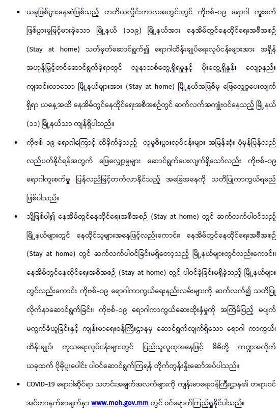 ကျန်းမာရေးဝန်ကြီးဌာနအနေဖြင့် နိုင်ငံအတွင်း ကူးစက်ဖြစ်ပွားနေသော COVID-19 ရောဂါ ကာကွယ်၊ ကုသ၊ ထိန်းချုပ်ရေး လုပ်ငန်းများကို အရှိန်အဟုန်မြှင့် ဆောင်ရွက်လျက်ရှိရာ ရောဂါ ထိန်းချုပ်ရေးလုပ်ငန်းများ အောင်မြင်နိုင်ရေးအတွက် ပြည်သူလူထု အနေဖြင့် ကျန်းမာရေး ဝန်ကြီးဌာနမှ ထုတ်ပြန်ထားသော COVID-19 ရောဂါ ကာကွယ်ထိန်းချုပ်ရေးဆိုင်ရာ စည်းကမ်းများကို စနစ်တကျ လိုက်နာဆောင်ရွက်ရန်လိုအပ်ပြီး COVID-19 ကာကွယ်ဆေး ထိုးနှံမှုခံယူခြင်းအား အထူးဂရုပြု ပူးပေါင်း ဆောင်ရွက်ကြရန် လိုအပ်ပါသည်။