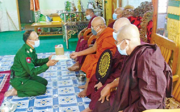 ထိုသို့ ဆောင်ရွက်လျက်ရှိရာ ယနေ့တွင် တနင်္သာရီတိုင်းဒေသကြီး၊ ကော့သောင်းမြို့၊ ရွှေပြည်သာကျောင်းတိုက်၊ ရန်ကုန်တိုင်းဒေသကြီး၊ မရမ်းကုန်းမြို့နယ်၊ အမှတ်(၃) ရပ်ကွက်ရှိ မဏိစည်သူကျောင်းတိုက်၊ မှော်ဘီမြို့နယ်၊ ရေပြာကျေးရွာရှိ အောင်ဓမ္မသိဒ္ဓိ ကျောင်းတိုက်၊ ဧရာဝတီတိုင်းဒေသကြီး၊ ပုသိမ်မြို့၊ သိမ်စမ်းပရိယတ္တိစာသင်တိုက်၊ ရခိုင်ပြည်နယ်၊ အမ်းမြို့၊ အောက်ရွာဘုန်းတော်ကြီးကျောင်းတိုက်၊ မန္တလေးတိုင်းဒေသကြီး၊ ပုသိမ်ကြီးမြို့နယ်၊ ရန်ကင်းတောင်ခြေရှိ ရန်အောင်မာန်အောင်ကျောင်းတိုက်နှင့် ပဲခူးတိုင်းဒေသကြီး၊ ပြည်မြို့၊ နဝဒေးရပ်ကွက်ရှိ ဝင်္ကပါတောရဘုန်းတော်ကြီး ကျောင်းတို့မှ ဆရာတော်၊ သံဃာတော်များနှင့် သာသနာနွယ်ဝင် သီလရှင်များအတွက် ဆွမ်းဆန်တော်၊ ဆီ၊ ဆား၊ ပဲ အမယ်(၄)မျိုး၊ ကိုဗစ်-၁၉ ရောဂါ ကာကွယ်ရေး အထောက်အကူပြုပစ္စည်းများ၊ နေ့ဆွမ်းများနှင့် လှူဖွယ်ပစ္စည်းများကို သက်ဆိုင်ရာ တိုင်းစစ်ဌာနချုပ် အသီးသီးမှ တိုင်းမှူးများနှင့် တာဝန်ရှိသူများက သွားရောက်ဆက်ကပ်လှူဒါန်းခဲ့ ကြကြောင်း သတင်းရရှိသည်။