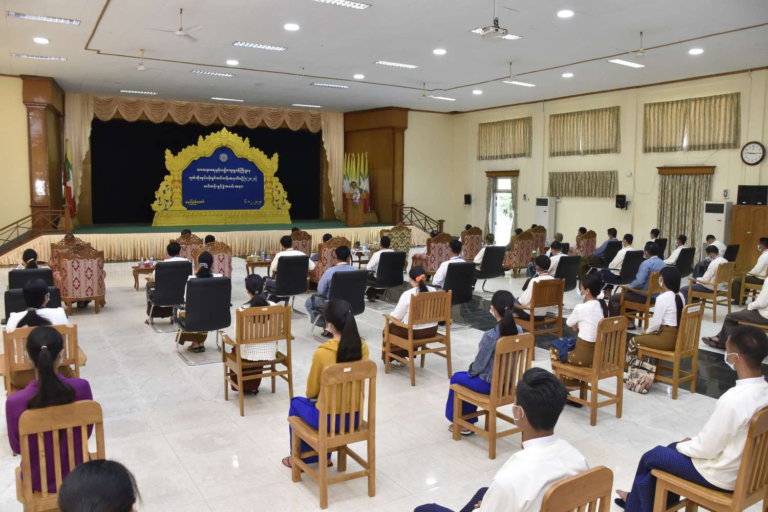 သာသနာရေးနှင့်ယဉ်ကျေးမှုဝန်ကြီးဌာန၌ တာဝန်ထမ်းဆောင်မည့် ပြည်ထောင်စုတိုင်းရင်း သားလူငယ်များ စွမ်းရည်ဖွံ့ဖြိုးရေးဒီဂရီကောလိပ် (ရန်ကုန်၊စစ်ကိုင်း) တို့မှ ကျောင်းဆင်း ဝန်ထမ်းများအထက် ဖွင့်လှစ်သည့် ရက်တိုလုပ်ငန်းခွင်သင်တန်းအမှတ်စဉ် (၁/၂၀၂၁) ဖွင့်ပွဲအခမ်း အနားကို ယနေ့နံနက် ၉ နာရီတွင် အဆိုပါဝန်ကြီးဌာန၊ စုပေါင်းအစည်းအဝေးခန်းမ၌ ကိုဗစ်-၁၉ ရောဂါ ကာကွယ်၊ ထိန်းချုပ်ရေးဆိုင်ရာ ညွှန်ကြားချက်များနှင့်အညီ ကျင်းပသည်။