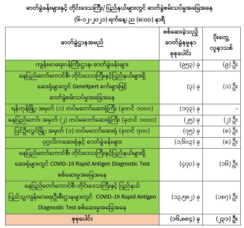 သို့ဖြစ်ပါ၍ ယနေ့အထိ ဓာတ်ခွဲနမူနာစုစုပေါင်း (၅,၆၉၈,၂၀၁) ခုအားစစ်ဆေးခဲ့ပြီး COVID-19 ဓာတ်ခွဲအတည်ပြုလူနာ စုစုပေါင်း (၅၂၄,၆၃၈) ဦး ရှိပြီ ဖြစ်ပါသည်။