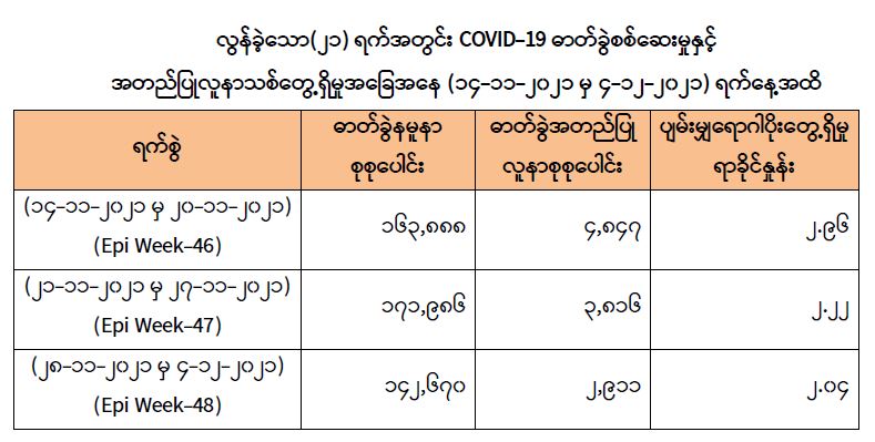 • ကျန်းမာရေးဝန်ကြီးဌာနအနေဖြင့် ကိုဗစ်-၁၉ ရောဂါကူးစက်ဖြစ်ပွားမှု အခြေအနေများအား ကူးစက်ရောဂါစောင့်ကြပ်ကြည့်ရှုရေး ရက်သတ္တပတ်အလိုက် ဓာတ်ခွဲနမူနာရယူစစ်ဆေးမှု၊ ဓာတ်ခွဲအတည်ပြုလူနာ တွေ့ရှိရမှုနှင့် ရောဂါပိုးတွေ့ရှိမှုနှုန်း အခြေအနေများအား စောင့်ကြပ် ကြည့်ရှုလျက်ရှိရာ အပတ်စဉ် (၄၆)၊ အပတ်စဉ် (၄၇) နှင့် အပတ်စဉ် (၄၈) တို့ကို နှိုင်းယှဉ်ချက် အရ ဓာတ်ခွဲအတည်ပြုလူနာတွေ့ရှိမှုနှင့် ပျမ်းမျှရောဂါပိုးတွေ့ရှိမှုနှုန်းများမှာ အပတ်စဉ်အလိုက် လျော့နည်း ကျဆင်းလျက်ရှိကြောင်း တွေ့ရှိရပါသည်။