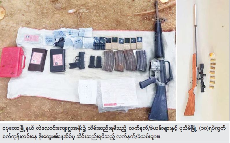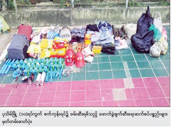 ဖြစ်စဉ်တွင် တရားခံ ကျား ၁၄ ဦး၊ မ ၂ ဦး၊ ပေါင်း ၁၆ ဦးတို့အား လက်နက်မျိုးစုံ ၄ လက်၊ ကျည်အိမ်မျိုးစုံ ၈ ခု၊ ကျည်မျိုးစုံ ၂၀၃ တောင့်၊ ရှေ့ထွက်မိုင်း ၃ လုံး၊ ဒီတိုနေတာ ၅၅ ချောင်း၊ ယမ်းထုပ် ၅ ထုပ်၊ လက်လုပ်သေနတ်ပြုလုပ်ရန် ဆင်ထားသည့် ပိုက် ၃ ခု၊ Laptop ၁ လုံး၊ သံလိုက်အိမ်မြှောင် ၂ ခု၊ ဖောက်ခွဲရေး ဆက်စပ်ပစ္စည်းများနှင့်အတူ ဖမ်းဆီးရမိခဲ့သည်။