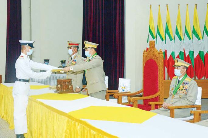 ဦးစွာ စစ်ရာထူးခန့်ချုပ်၊ တပ်မတော်အရာရှိကြီးများနှင့် ကျောင်းအုပ်ကြီး တို့က စင်မြင့်ထက်တွင် နေရာယူကြသည်။ ယင်းနောက် ဒုတိယဗိုလ်ချုပ်ကြီး လင်းအောင်က ကျောင်းဆင်းဗိုလ်လောင်းတစ်ဦးချင်းစီအား ပြန်တမ်းဝင်ခန့်အပ် လွှာပေးအပ်သည်။