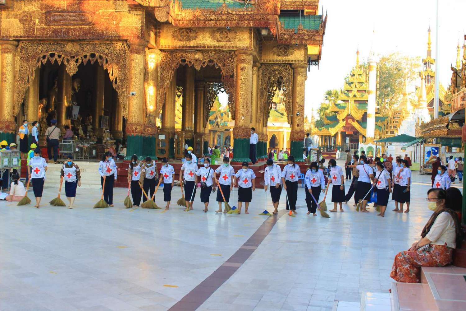 ရှေးဦးစွာ ဝန်ကြီးချုပ် ဦးလှစိုးနှင့် တာဝန်ရှိသူများသည် စေတီတော်မြတ်ကြီး ရင်ပြင်တော်၌ အထွေထွေ အုပ်ချုပ်ရေးဦးစီးဌာန၊ မီးသတ်ဦးစီးဌာန၊ စည်ပင်သာယာဝန်ထမ်းများ၊ ဌာနဆိုင်ရာများမှ ဝန်ထမ်းများ၊ မြန်မာနိုင်ငံ ကြက်ခြေနီအသင်းမှ ကြက်ခြေနီသူနာပြုတပ်ဖွဲ့ဝင်များ၊ တပ်မတော်သားများက ရင်ပြင်တော်တစ်လျှောက် တံမြက်စည်းလှည်းခြင်း၊ ဆီးမီးပူဇော် စုပေါင်းသန့်ရှင်းရေးပြုလုပ်၍ ကုသိုလ်ယူ ဆောင်ရွက်နေမှုကို လိုက်လံကြည့်ရှု့ အားပေးခဲ့ကြပြီး၊ ရင်ပြင်တော် တစ်ပတ် လိုက်လံကြည့်ရှု ကြည်ညိုခဲ့ရာ စေတီတော်မြတ်ကြီး ရေရှည်တည်တံ့ ခိုင်မြဲရေးအတွက် ထိန်းသိမ်းဆောင်ရွက်နေမှု၊ စေတီတော်ရင်ပြင် သန့်ရှင်းသာယာလှပစေရေးနှင့် ဘုရားဖူး လာပြည်သူများ အေးအေးချမ်းချမ်း လာရောက်ဖူးမြှော်ကြည်ညိုနိုင်ရေးအတွက် ဆောင်ရွက်နေမှုများအား ရွှေတိဂုံစေတီတော် ဘဏ္ဍာတော်ထိန်း ဂေါပကအဖွဲ့ဝင်များက ရှင်းလင်းတင်ပြခဲ့ကြောင်း သိရသည်။