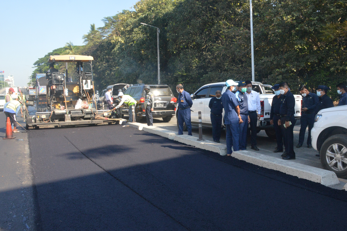 ထို့နောက် မြို့တော်ဝန်နှင့် ဥပဒေချုပ်တို့သည် ကမာရွတ်မြို့နယ် လှည်းတန်း ခုံးကျော်တံတားနှင့် ဟံသာဝတီအဝိုင်းအကြား ပြည်လမ်း တစ်လျှောက် အင်ဂျင်နီယာဌာန (လမ်းနှင့်တံတား)မှ ဆောင်ရွက်နေသည့် အလျား ပေ ၃၅၀၀၊ အနံ ၇၂ ပေ၊ ထု ၂ လက်မ ကတ္တရာကွန်ကရိ(AC) ခင်းကျင်းနေမှုကို ကြည့်ရှုစစ်ဆေးပြီး ယာဉ်အန္တရာယ်ကင်းရှင်းရေး၊ လမ်းဘေးလူသွားစင်္ကြံများ ကောင်းမွန်စေရေးနှင့် Road Marking ယာဉ်ကြောပြမျဉ်း ရေးဆွဲရေးတို့အတွက် မှာကြားပြီး လိုအပ်သည်များ ဖြည့်ဆည်း ဆောင်ရွက်ပေးသည်။