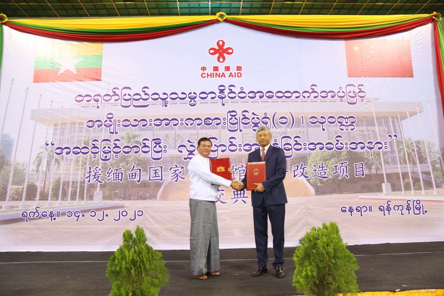 ဆက်လက်၍ အမျိုးသားအားကစားပြိုင်ပွဲရုံ(၁)သုဝဏ္ဏအဆင့်မြှင့်တင်ပြီး လွှဲပြောင်းအပ်နှံခြင်း စာချွန်လွှာကို တရုတ်ပြည်သူ့သမ္မတနိုင်ငံ သံအမတ်ကြီး မစ္စတာချန်းဟိုင်နှင့် အားကစားနှင့် လူငယ်ရေးရာဝန်ကြီးဌာန ပြည်ထောင်စုဝန်ကြီး ဦးမင်းသိန်းဇံတို့က အပြန်အလှန် လဲလှယ် ပေးအပ်သည်။