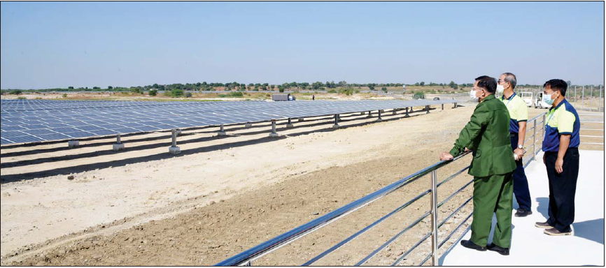 ထို့နောက် နိုင်ငံတော်စီမံအုပ်ချုပ်ရေးကောင်စီဥက္ကဋ္ဌ နိုင်ငံတော်ဝန်ကြီးချုပ်က မိမိတို့နိုင်ငံမှ ထုတ်လုပ်လျက်ရှိသည့် ဆိုလာပြားများနှင့် ပြည်ပနိုင်ငံများမှ ထုတ်လုပ် သည့် ဆိုလာပြားများ၏ အရည်အသွေးများနှိုင်းယှဉ်၍ အရည်အသွေးပြည့်မီသည့် ဆိုလာပြားများ ပြည်တွင်း၌ အလုံအလောက်ထုတ်လုပ်နိုင်ရေး ကြိုးပမ်းဆောင်ရွက်ရန် လိုကြောင်း၊မိမိတို့နိုင်ငံအတွင်း နေရောင်ခြည်စွမ်းအင်သုံးလျှပ်စစ်ဓာတ်အား ထုတ်လုပ်ရေးစက်ရုံများ လုံလောက်စွာ တည်ဆောက်၍ နိုင်ငံတော်၏ လျှပ်စစ်ဓာတ်အားလိုအပ် ချက်ကို ဖြည့်ဆည်းပေးရန်လိုကြောင်း၊ ဆိုလာလျှပ်စစ်ဓာတ်အားထုတ်ယူမှုသည် အကြောင်းအမျိုးမျိုးကြောင့် ရင်းနှီးမြှုပ်နှံမှုကြီးမြင့်ခဲ့ သော်လည်း တည်ဆောက်မှုအချိန် ကာလနည်းပါးခြင်း၊ နောက်ပိုင်း ကုန်ကျစရိတ်သက်သာခြင်း စသည့်အကျိုးကျေးဇူး များရှိကြောင်း၊ အလားတူ ကျေးရွာများတွင်လည်း ဆိုလာများများ တပ်ဆင်၍ လျှပ်စစ်ဓာတ်အားများထုတ်လုပ်မည် ဆိုပါက ပြည်သူများ၏ လျှပ်စစ်သုံးစွဲမှုကို ပိုမိုအထောက်အကူပြုမည်ဖြစ်ပြီး ၎င်းတို့၏ လူနေမှုဘဝ ဖွံ့ဖြိုးတိုးတက်စေမည်ဖြစ်ကြောင်း၊ စိုက်ပျိုးမှုမဖြစ်ထွန်းသည့် မြေနေရာ များကိုလည်း အကျိုးရှိစွာအသုံးချ နိုင်ရန်လိုကြောင်း၊ နေရောင်ခြည်စွမ်းအင်အား အသုံးပြု၍ စိုက်ပျိုးရေရရှိရေး လုပ်ငန်းများကိုလည်း ဆောင်ရွက်နိုင်မည်ဖြစ်ကြောင်း၊ မိတ္ထီလာဒေသတွင် ဝါစိုက်ပျိုး မှုဖြစ်ထွန်းရေးအတွက် လိုအပ်သည့် စိုက်ပျိုးရေများအား ဆိုလာစနစ်ဖြင့် အသုံးချ၍ရနိုင်ကြောင်း၊ နိုင်ငံတစ်ဝန်း နေရောင်ခြည် စွမ်းအင်သုံး လျှပ်စစ်ဓာတ်အား ထုတ်လုပ်ခြင်း များဆောင်ရွက်နိုင်ခြင်းဖြင့် နိုင်ငံဖွံ့ဖြိုးတိုးတက်ရေးအတွက် များစွာအထောက်အကူ ပြုမည်ဖြစ်ကြောင်း၊ နေရောင်ခြည်စွမ်းအင်သုံး လျှပ်စစ်ဓာတ်အား ထုတ်လုပ်ခြင်းများနှင့်ပတ်သက်၍ နိုင်ငံတော်မှ လိုအပ်သည်များ ကူညီဆောင်ရွက်ပေးသွားမည်ဖြစ်ကြောင်း ပြောကြားသည်။
