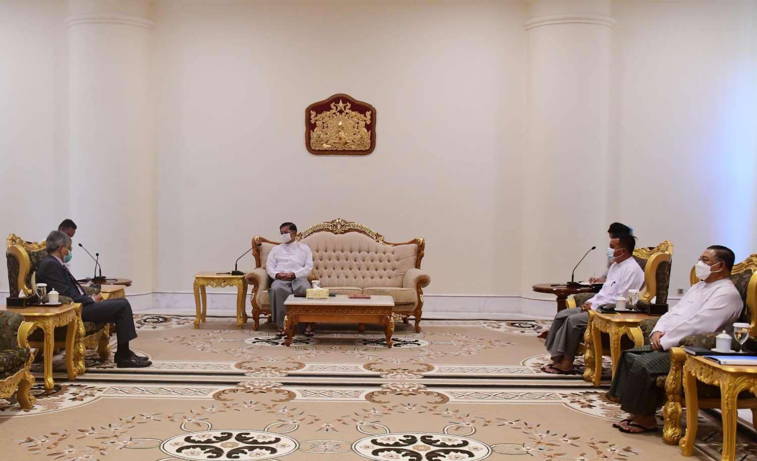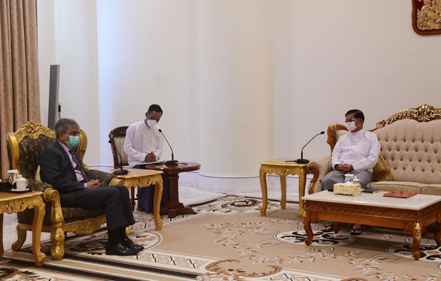 နိုင်ငံတော်စီမံအုပ်ချုပ်ရေးကောင်စီဥက္ကဋ္ဌ၊ နိုင်ငံတော်ဝန်ကြီးချုပ် ဗိုလ်ချုပ်မှူးကြီး မင်းအောင်လှိုင်သည် တာဝန်ပြီးဆုံး၍ ပြန်လည်ထွက်ခွာမည့် မြန်မာနိုင်ငံဆိုင်ရာ အိန္ဒိယနိုင်ငံသံအမတ်ကြီး H.E. Mr. Saurabh Kumar အား ယနေ့မွန်းလွဲပိုင်းတွင် နေပြည်တော်ရှိ နိုင်ငံတော်စီမံအုပ်ချုပ်ရေးကောင်စီဥက္ကဋ္ဌရုံး၊ ဧည့်ခန်းမ၌ လက်ခံတွေ့ဆုံသည်။