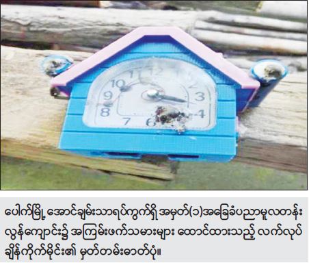 အလားတူ နံနက် ၁၀ နာရီ ၂၀ မိနစ်ခန့်တွင် အောင်ချမ်းသာရပ်ကွက်ရှိ အမှတ်() အခြေခံပညာမူလတန်းလွန်ကျောင်း၌ မသင်္ကာဖွယ်အထုပ်တစ်ထုပ်တွေ့ရှိကြောင်း သတင်းအရ လုံခြုံရေးတပ်ဖွဲ့ဝင်များနှင့်  ဆရာ၊ ဆရာမများက သွားရောက်စစ်ဆေးခဲ့ရာ အဆိုပါကျောင်းဝင်း အတွင်း အနောက်ဘက်ခြံစည်းရိုးအုတ်တံတိုင်းနှင့် ၁၅ ပေခန့်အကွာ၌ အနက်ရောင်ပလပ်စတစ် အိတ်ဖြင့် ထုပ်ထားသည့် အထုပ်တစ်ထုပ်အား တွေ့ရှိရသဖြင့် ဖွင့်ဖောက်စစ်ဆေးခဲ့ရာ အဆိုပါအိတ် အတွင်းမှ အလျား လက်မခန့်၊ အချင်း လက်မခန့်ရှိ PVC ပိုက်ဖြင့်ပြုလုပ်ထားပြီး စားပွဲတင်နာရီတစ်လုံးဖြင့် ချိတ်ဆက်ထားသည့် လက်လုပ်ချိန်ကိုက်မိုင်းတစ်လုံးအား တွေ့ရှိရသဖြင့် သက်မဲ့ပြုလုပ် ဖောက်ခွဲဖျက်ဆီး ရှင်းလင်းခဲ့ကြောင်း သိရသည်။