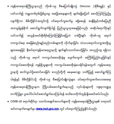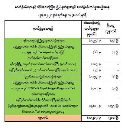 ကျန်းမာရေးဝန်ကြီးဌာနအနေဖြင့် နိုင်ငံအတွင်း ကူးစက်ဖြစ်ပွားနေသော COVID-19 ရောဂါ ကာကွယ်၊ ကုသ၊ ထိန်းချုပ်ရေး လုပ်ငန်းများကို အရှိန်အဟုန်မြှင့် ဆောင်ရွက်လျက်ရှိပါသည်။