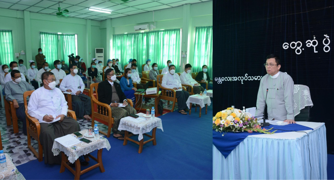 ထို့နောက် ပြည်ထောင်စုဝန်ကြီးသည် ခေတ္တဆေးရုံအုပ်ကြီးနှင့် တာဝန်ရှိသူများ၏ တင်ပြချက်များအပေါ် ဖြည့်ဆည်းဆောင်ရွက် ပေးခဲ့ပြီးကိုဗစ်-၁၉ ရောဂါ ကာကွယ်ရေးသုံး နှာခေါင်းစည်း (Mask)များ ပေးအပ်သည်။