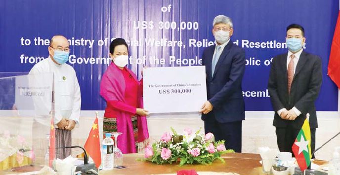 ထို့နောက် သံအမတ်ကြီး မစ္စတာ ချန်းဟိုင်က တရုတ်နိုင်ငံအစိုးရကိုယ်စား လူမှုဝန်ထမ်း၊ ကယ်ဆယ် ရေးနှင့် ပြန်လည်နေရာချထားရေးဝန်ကြီးဌာန အတွက် အမေရိကန်ဒေါ်လာ သုံးသိန်း လွှဲပြောင်း ပေးအပ်လှူဒါန်းခြင်း ဖြစ်ပါကြောင်း၊ ယခုလှူဒါန်းမှုသည် မြန်မာနိုင်ငံ ငြိမ်းချမ်းရေးဖော်ဆောင်မှုများ အတွက် နှစ်စဉ် အမေရိကန်ဒေါ်လာတစ်သန်း လှူဒါန်းမှု၏ အစိတ်အပိုင်းဖြစ်ပြီး ယခုအကြိမ်သည် (၆)ကြိမ်မြောက်ဖြစ် ပါကြောင်း ပြောကြားသည်။