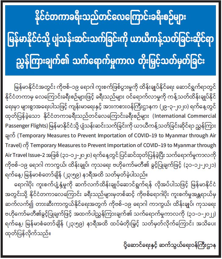 နိုင်ငံတကာခရီးသည်တင်လေကြောင်းခရီးစဉ်များ မြန်မာနိုင်ငံသို့ ပျံသန်းဆင်းသက်ခြင်းကို ယာယီကန့်သတ်ခြင်းဆိုင်ရာ ညွှန်ကြားချက်၏ သက်ရောက်မှုကာလ တိုးမြှင့်သတ်မှတ်ခြင်း 01/01/2022