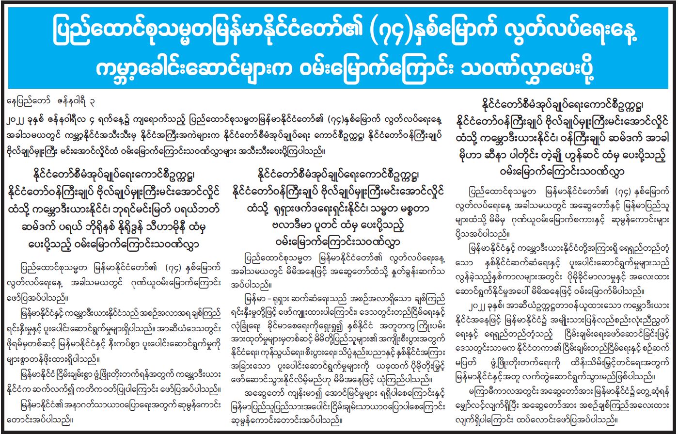 ပြည်ထောင်စုသမ္မတမြန်မာနိုင်ငံတော်၏ (၇၄)နှစ်မြောက် လွတ်လပ်ရေးနေ့ ကမ္ဘာ့ခေါင်းဆောင်များက ဝမ်းမြောက်ကြောင်း သဝဏ်လွှာပေးပို့ 01/04/2022
