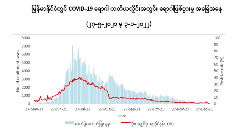 • ကျန်းမာရေးဝန်ကြီးဌာနမှ ဝန်ထမ်းများ၏ အားတက်သရော ကြိုးပမ်းဆောင်ရွက်မှု၊ ပြည်သူလူထုမှ စနစ်တကျစည်းကမ်းလိုက်နာမှု၊ ဌာနဆိုင်ရာအသီးသီးမှ ဟန်ချက်ညီ ပူးပေါင်းဆောင်ရွက်မှုနှင့် လူမှုရေးအသင်း အဖွဲ့အစည်းများမှ တက်ကြွစွာ ပံ့ပိုးပူးပေါင်းဆောင်ရွက်မှုတို့ကြောင့် ရောဂါ စောင့်ကြပ်ကြည့်ရှုရေးဆိုင်ရာ ရက်သတ္တပတ်အလိုက် သုံးသပ်ချက်များအရ ဓာတ်ခွဲအတည်ပြုလူနာ တွေ့ရှိရမှုနှင့် ရောဂါပိုးတွေ့ရှိမှု ရာခိုင်နှုန်းတို့မှာ တဖြည်းဖြည်းလျော့နည်း ကျဆင်းလာကြောင်း တွေ့ရှိရပါသည်။