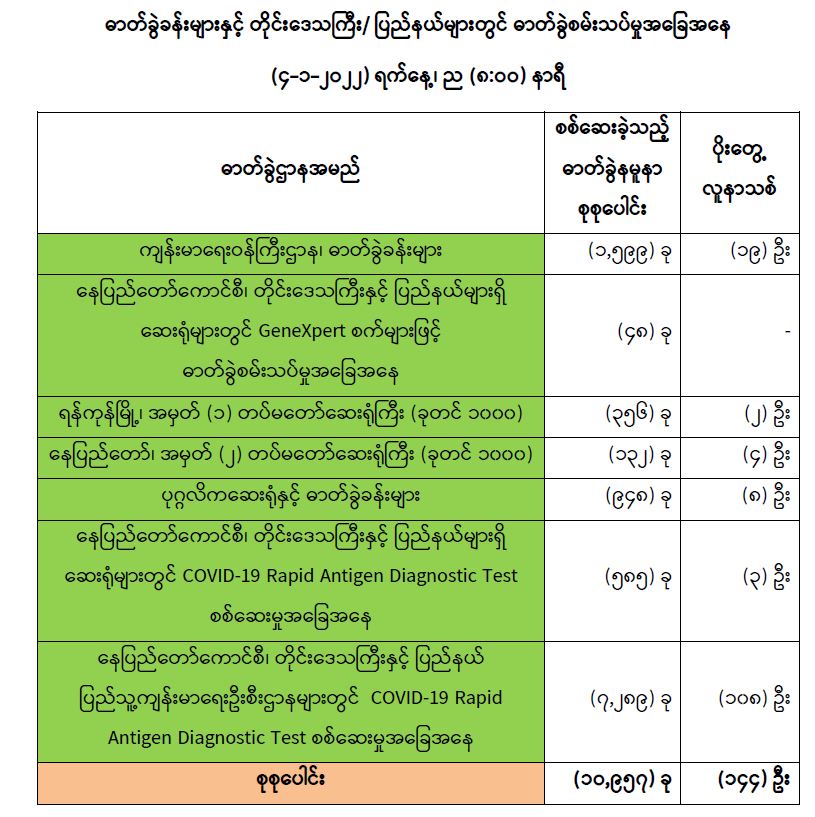 သို့ဖြစ်ပါ၍ ယနေ့အထိ ဓာတ်ခွဲနမူနာစုစုပေါင်း (၆,၀၇၆,၄၄၇) ခုအား စစ်ဆေးခဲ့ပြီး COVID-19 ဓာတ်ခွဲအတည်ပြုလူနာ စုစုပေါင်း (၅၃၁,၂၉၉) ဦး ရှိပြီ ဖြစ်ပါသည်။
