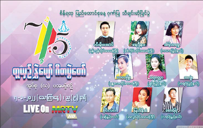 စိန်ရတု ပြည်ထောင်စုနေ့ကို ဂုဏ်ပြုသောအားဖြင့် “တူယှဉ် နွှဲပျော် ဂီတပွဲတော်” သီချင်းဆို ပြိုင်ပွဲ အုပ်စု(၄) ပထမပွဲစဉ်ကို ဇန်နဝါရီ ၇ ရက် (သောကြာနေ့) ညတွင် မြန်မာ့အသံနှင့်ရုပ်မြင် သံကြားမှတိုက်ရိုက် Liveရိုက်ကူး ထုတ်လွှင့်မည်။