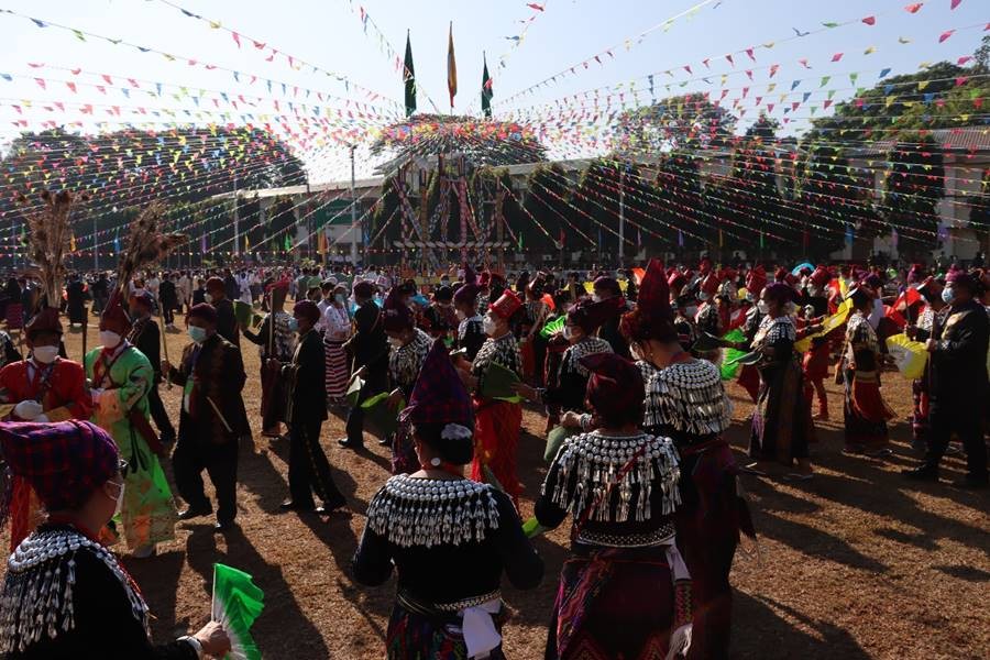 (၇၄)နှစ်မြောက် ကချင်ပြည်နယ်နေ့ အခမ်းအနားကို ယနေ့နံနက်ပိုင်းတွင် ကချင်ပြည်နယ်၊ အစိုးရအဖွဲ့ရုံး မြက်ခင်းပြင်၌ ပြုလုပ်ရာ နိုင်ငံတော်စီမံအုပ်ချုပ်ရေးကောင်စီအဖွဲ့ဝင် Jeng Phang နော်တောင်၊ ဦးမောင်းဟာ၊ ဦးစိုင်းလုံးဆိုင်၊ ဦးရွှေကြိမ်း၊ ပြည်ထောင်စုဝန်ကြီးများ ဖြစ်ကြသည့် ဒုတိယဗိုလ်ချုပ်ကြီး ထွန်းထွန်းနောင်၊ ဦးခင်ရီ၊ ဦးစောထွန်းအောင်မြင့်၊ ကချင်ပြည်နယ်ဝန်ကြီးချုပ် ဦးခက်ထိန်နန်နှင့် အဖွဲ့ဝင်များ၊ မြောက်ပိုင်းတိုင်းစစ်ဌာနချုပ် တိုင်းမှူး ဗိုလ်မှူးချုပ် မြတ်သက်ဦးနှင့် အဖွဲ့ဝင်များ၊ ဌာနဆိုင်ရာများမှ တာဝန်ရှိသူများနှင့် ဒေသခံတိုင်းရင်းသားပြည်သူများ တက်ရောက်ကြသည်။