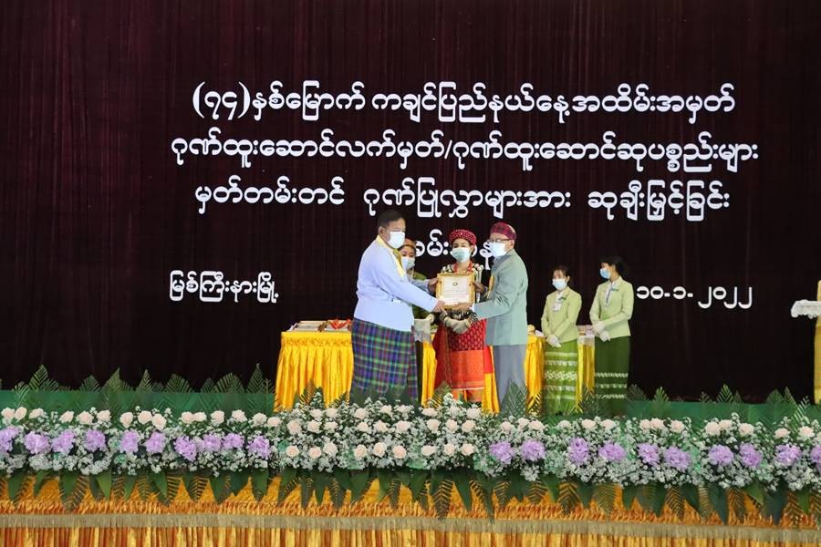 ဆက်လက်၍ နေ့လယ်ပိုင်းတွင် (၇၄)နှစ်မြောက် ကချင်ပြည်နယ်နေ့ အထိမ်းအမှတ် ဂုဏ်ထူးဆောင်လက်မှတ်၊ ဂုဏ်ထူးဆောင်ဆုပစ္စည်း များနှင့်မှတ်တမ်းတင်ဂုဏ်ပြုလွှာ ရရှိသူများအား ဆုချီးမြှင့်ခြင်းအခမ်းအနားကို မြစ်ကြီးနားမြို့၊ မြို့တော်ခန်းမ၌ ကျင်းပပြုလုပ်ခဲ့ပြီး နိုင်ငံတော်စီမံအုပ်ချုပ်ရေးကောင်စီအဖွဲ့ဝင်များနှင့် ပြည်ထောင်စုဝန်ကြီးများ၊ ကချင်ပြည်နယ်ဝန်ကြီးချုပ်နှင့် အစိုးရအဖွဲ့ဝန်ကြီးများ၊ မြောက်ပိုင်းတိုင်းစစ်ဌာနချုပ် တိုင်းမှူးတို့က စီမံခန့်ခွဲရေးဆိုင်ရာ ထူးချွန်ဆုပထမအဆင့်(၈)ဦး၊ ဒုတိယအဆင့်(၁၆)ဦး၊ တတိယအဆင့်(၂၂)ဦး၊ စီးပွားရေးဆိုင်ရာထူးချွန်ဆု ဒုတိယအဆင့်(၅)ဦး၊ တတိယအဆင့်(၁)ဦး၊ လူမှုရေးဆိုင်ရာ ထူးချွန်ဆု ပထမအဆင့် (၆)ဦး၊ ဒုတိယအဆင့်(၁၁)ဦး၊ တတိယအဆင့်(၉)ဦးနှင့် ဂုဏ်ပြုမှတ်တမ်းလွှာ ရရှိသူ(၁၉၃)ဦး၊ စုစုပေါင်း(၂၇၁)ဦးတို့အား ဂုဏ်ထူးဆောင်လက်မှတ်၊ ဂုဏ်ထူးဆောင်ဆု ပစ္စည်းများနှင့် မှတ်တမ်းတင်ဂုဏ်ပြုလွှာများကို အသီးသီးပေးအပ်ချီးမြှင့်ခဲ့သည်။