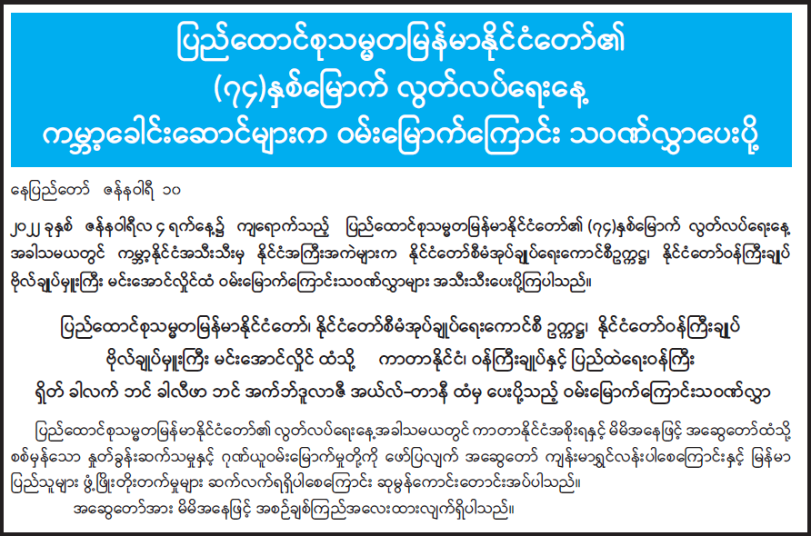 ပြည်ထောင်စုသမ္မတမြန်မာနိုင်ငံတော်၏ (၇၄)နှစ်မြောက် လွတ်လပ်ရေးနေ့ ကမ္ဘာ့ခေါင်းဆောင် များက ဝမ်းမြောက်ကြောင်း သဝဏ်လွှာပေးပို့ 01/11/2022 နေပြည်တော် ဇန်နဝါရီ ၁၀