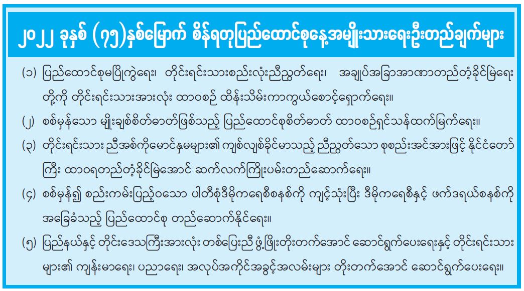၂၀၂၂ ခုနှစ်(၇၅)နှစ်မြောက် စိန်ရတုပြည်ထောင်စုနေ့ အမျိုးသားရေးဦးတည်ချက်များ