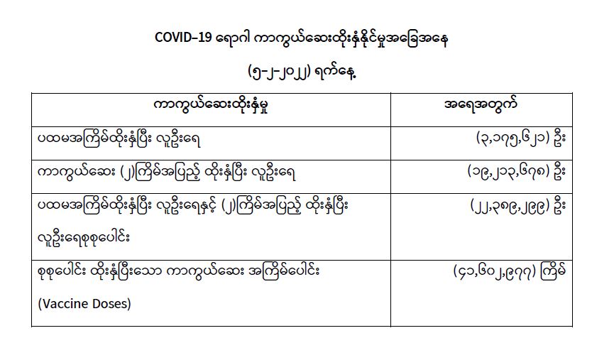 COVID-19 ရောဂါ ကာကွယ်ထိန်းချုပ်ရေးအတွက် တိုင်းဒေသကြီး/ပြည်နယ်များတွင် COVID-19 ရောဂါကာကွယ်ဆေးကို ဦးတည်အုပ်စုများသတ်မှတ်၍ ထိုးနှံပေးလျက်ရှိရာ (၅-၂-၂၀၂၂) ရက်နေ့အထိ လူဦးရေစုစုပေါင်း (၂၂,၃၈၉,၂၉၉) ဦးအား ထိုးနှံပေးပြီးဖြစ်၍ ကာကွယ်ဆေး နှစ်ကြိမ်အပြည့် ထိုးနှံပြီးစီးသူ (၁၉,၂၁၃,၆၇၈) ဦးနှင့် ပထမအကြိမ် ထိုးနှံပြီးစီးသူ (၃,၁၇၅,၆၂၁) ဦး ရှိပြီဖြစ်ပါသည်။ သို့ဖြစ်ပါ၍ (၅-၂-၂၀၂၂) ရက်နေ့အထိ မြန်မာနိုင်ငံတွင် COVID-19 ရောဂါကာကွယ်ဆေး အကြိမ်ရေ စုစုပေါင်း (၄၁,၆၀၂,၉၇၇) ကြိမ် ထိုးနှံပြီး ဖြစ်ပါသည်။