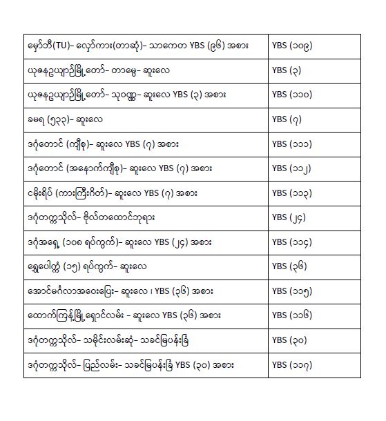 ရန်ကုန်တိုင်းဒေသကြီး ပုဂ္ဂလိကသယ်ယူပို့ဆောင်ရေး ကြီးကြပ်မှုကော်မတီ (YRTC) ကြီးကြပ်မှု ဖြင့် YBS ယာဉ်လိုင်းများ ပြေးဆွဲလျက်ရှိသော YBS ကုမ္ပဏီများမှ စီမံမှုအောက်ရှိ ယာဉ်လိုင်းနံ ပါတ်တူ ဂိတ်ရင်း၊ ဂိတ်ဖျားမတူသောယာဉ်လိုင်းများအား ၁၂-၂-၂၀၂၂ ရက်နေ့မှစ၍ ဖော်ပြပါ အတိုင်း ယာဉ်လိုင်းနံပါတ်အသစ်များဖြင့် ပြောင်းလဲပြေးဆွဲသွားမည်ဖြစ်ကြောင်း သတင်းရရှိသည်-