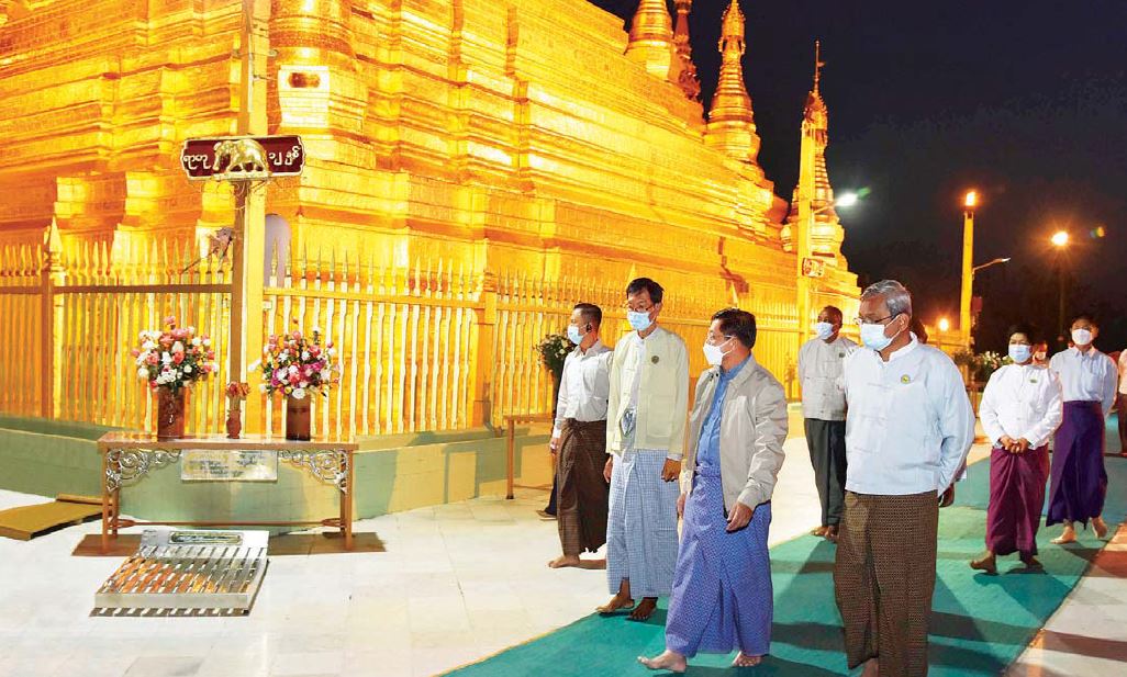 ယင်းနောက် နိုင်ငံတော်စီမံအုပ်ချုပ်ရေးကောင်စီဥက္ကဋ္ဌ နိုင်ငံတော်ဝန်ကြီးချုပ်နှင့် ဇနီးတို့သည် ဘုရားဂေါပကအဖွဲ့ထံအလှူငွေများ ပေးအပ်လှူဒါန်းပြီး ဘုရားဂေါပကအဖွဲ့က ဓမ္မလက်ဆောင် များ ပြန်လည်ပေးအပ်သည်။ ထို့နောက်နိုင်ငံတော်စီမံ အုပ်ချုပ်ရေးကောင်စီဥက္ကဋ္ဌ နိုင်ငံတော် ဝန်ကြီးချုပ်သည် ဧည့်သည်တော်မှတ်တမ်းစာအုပ်တွင် လက်မှတ်ရေးထိုး ပြီးစေတီတော် ကြီးအား လက်ယာရစ်လှည့်လည် ဖူးမြော်ကြည် ညိုခဲ့ပြီးနောက် ဘုရားဖူးလာရောက်သော ဒေသခံပြည်သူများအား ရင်းရင်းနှီးနှီး နှုတ်ဆက်စကားများ ပြောကြားခဲ့ကြောင်း သတင်းရရှိသည်။