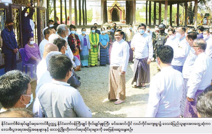 ထို့နောက် ရပ်မိရပ်ဖများက လုပ်သားရှားပါးသည့်အတွက် လယ်ယာသုံးစက်ကိရိယာများကို အရစ်ကျစနစ်ဖြင့် ရောင်းချပေးရန်လိုအပ်မှု၊ ကျေးရွာအတွက် မီးသတ်ကား လိုအပ်မှုနှင့် အခြားဒေသဖွံ့ဖြိုးတိုးတက်ရေးကိစ္စရပ်များကို တင်ပြကြရာ နိုင်ငံတော်စီမံအုပ်ချုပ်ရေး ကောင်စီဥက္ကဋ္ဌက လယ်ယာသုံး စက်ကိရိယာများကို အရစ်ကျစနစ်ဖြင့် ရောင်းချပေးနိုင်ရေး၊ ကျေးရွာအတွက်လိုအပ်သည့် မီးသတ်ကား နွေရာသီမတိုင်မီ ရောက်ရှိရေး၊ ရွှေပြည်အေးဘုရား ပြန်လည်ပြုပြင်မွမ်းမံရေးနှင့် အခြားဒေသ ဖွံ့ဖြိုးတိုး တက်ရေးဆိုင်ရာ ကိစ္စရပ်များ ဆောင်ရွက်ပေးနိုင်ရန်အတွက် တာဝန်ရှိသူများကို လမ်းညွှန်မှာကြားသည်။