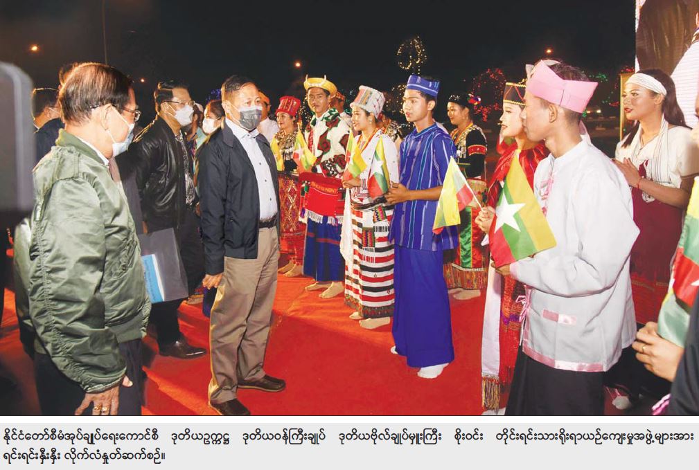 ဦးစွာ နိုင်ငံတော်စီမံအုပ်ချုပ်ရေးကောင်စီ ဒုတိယဥက္ကဋ္ဌ၊ ဒုတိယဝန်ကြီးချုပ် ဒုတိယဗိုလ်ချုပ်မှူးကြီး စိုးဝင်းသည် နေပြည်တော် မြို့တော်ခန်းမ ဥပစာရင်ပြင် သို့ ရောက်ရှိပြီး တိုင်းရင်းသားရိုးရာ ယဉ်ကျေးမှုအဖွဲ့များအား ရင်းရင်းနှီးနှီး လိုက်လံနှုတ်ဆက်သည်။