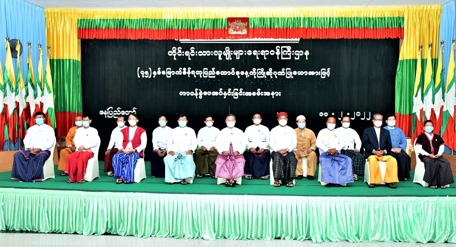 (၇၅)နှစ်မြောက် စိန်ရတုပြည်ထောင်စုနေ့ကို ဂုဏ်ပြုသောအားဖြင့် တိုင်းရင်းသားများ၏ လူမှုစီးပွားဘဝပိုမိုဖွံ့ဖြိုးတိုးတက်ရေးအတွက် တိုင်းဒေသကြီး/ပြည်နယ် တိုင်းရင်းသားရေးရာ ဝန်ကြီးများအား တာဝန်ခွဲဝေအပ်နှင်းခြင်းအခမ်းအနားကို ယနေ့နံနက် ၁၀ နာရီခွဲတွင် တိုင်းရင်းသားလူမျိုးများရေးရာဝန်ကြီးဌာန အစည်းအဝေးခန်းမ၌ ကိုဗစ်-၁၉ တားဆီးကာကွယ်ရေး၊ ကျန်းမာရေးဆိုင်ရာ ညွှန်ကြားချက်များနှင့်အညီ ကျင်းပသည်။
