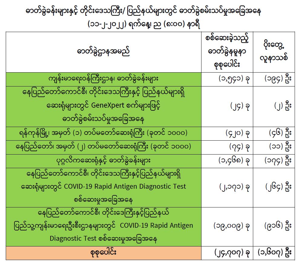 သို့ဖြစ်ပါ၍ ယနေ့အထိ ဓာတ်ခွဲနမူနာစုစုပေါင်း (၆,၆၄၄,၂၄၉) ခုအား စစ်ဆေးခဲ့ပြီး COVID-19 ဓာတ်ခွဲအတည်ပြုလူနာ စုစုပေါင်း (၅၄၃,၅၁၁) ဦး ရှိပြီ ဖြစ်ပါသည်။