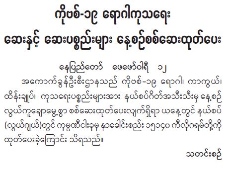 ကိုဗစ်- ၁၉ ရောဂါကုသရေး ဆေးနှင့် ဆေးပစ္စည်းများ နေ့စဉ်စစ်ဆေးထုတ်ပေး