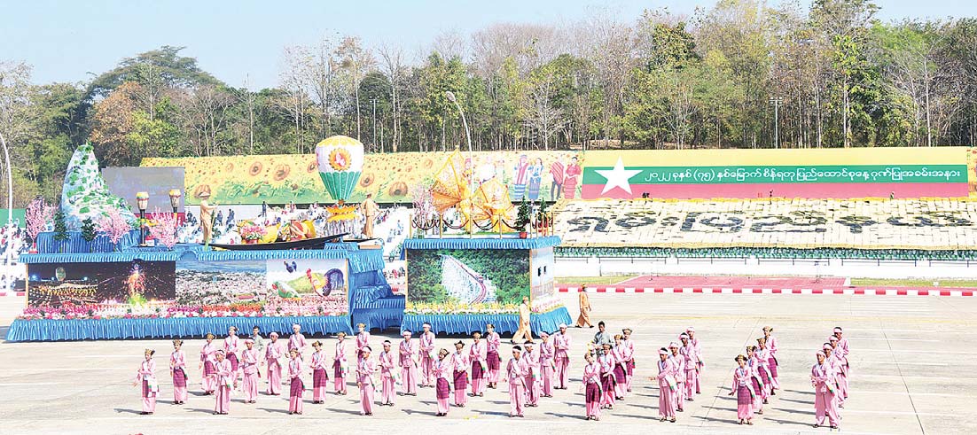 ထို့နောက် မြန်မာနိုင်ငံအတွင်းရှိ တိုင်းရင်းသားများ၏ အထိမ်းအမှတ်များ၊ လူနေမှုစရိုက်များ၊ ဓလေ့ထုံးတမ်းအစဉ်အလာများနှင့် ထုတ်ကုန်များ ကို သရုပ်ဖော်ပြသထားသည့် နေပြည်တော် ကောင်စီနယ်မြေကိုယ်စားပြု ဂုဏ်ပြုယာဉ်များနှင့်အတူ ဂုဏ်ပြုအကအဖွဲ့က “ပြည်ထောင်စုသွေး” သီချင်းဖြင့်လည်းကောင်း၊ ကချင်ပြည်နယ် ကိုယ်စားပြု ဂုဏ်ပြု ယာဉ်များနှင့်အတူ ဂုဏ်ပြုအကအဖွဲ့က “မမေ့နိုင်တဲ့မြေ” သီချင်းဖြင့်လည်းကောင်း၊ ကယားပြည်နယ် ကိုယ်စားပြု ဂုဏ်ပြုယာဉ်များနှင့်အတူ ဂုဏ်ပြုအကအဖွဲ့က “ဖားစည်သံ” သီချင်းဖြင့်လည်းကောင်း၊ ကရင်ပြည်နယ်ကိုယ်စားပြု ဂုဏ်ပြုယာဉ်များနှင့်အတူ ဂုဏ်ပြုအက အဖွဲ့က “အောဟု - အောဟောင်” သီချင်းဖြင့် လည်းကောင်း၊ ချင်းပြည်နယ်ကိုယ်စားပြု ဂုဏ်ပြုယာဉ်များနှင့်အတူ ဂုဏ်ပြုအကအဖွဲ့က “ပျော်ရွှင်ဖွယ်နေ့ရက်များဆီသို့” သီချင်းဖြင့် လည်းကောင်း၊ စစ်ကိုင်းတိုင်းဒေသကြီး ကိုယ်စားပြုဂုဏ်ပြုယာဉ်များနှင့်အတူ ဂုဏ်ပြုအက အဖွဲ့က “အောင်လံ တဝေဝေ ရွှေစစ်ကိုင်းဌာနေ” သီချင်းဖြင့်လည်းကောင်း၊ တနင်္သာရီ တိုင်းဒေသကြီး ကိုယ်စားပြု ဂုဏ်ပြုယာဉ်များနှင့်အတူ ဂုဏ်ပြုအကအဖွဲ့က “တိုးတက်ဝေစည် တနင်္သာရီ” သီချင်းဖြင့်လည်းကောင်း၊ ပဲခူးတိုင်းဒေသကြီးကိုယ်စားပြု ဂုဏ်ပြုယာဉ်များနှင့်အတူ ဂုဏ်ပြုအကအဖွဲ့က “ပဲခူးဟုခေါ်သည်” သီချင်းဖြင့်လည်းကောင်း၊ မကွေးတိုင်း ဒေသကြီး ကိုယ်စားပြုဂုဏ်ပြုယာဉ်များနှင့်အတူ ဂုဏ်ပြုအကအဖွဲ့က “လှသော အညာမြေ” သီချင်းဖြင့်လည်းကောင်း၊ မန္တလေးတိုင်းဒေသကြီး ကိုယ်စားပြု ဂုဏ်ပြုယာဉ်များနှင့် အတူဂုဏ်ပြုအကအဖွဲ့က “လှမ်းခဲ့ပေါ့မန္တလာမြေ” သီချင်းဖြင့်လည်းကောင်း၊ မွန်ပြည်နယ် ကိုယ်စားပြု ဂုဏ်ပြုယာဉ်များနှင့်အတူ ဂုဏ်ပြုအကအဖွဲ့က “တွဲလက်ညီညီ ရှေ့သို့ချီ” သီချင်းဖြင့်လည်းကောင်း၊ ရခိုင်ပြည်နယ် ကိုယ်စားပြု ဂုဏ်ပြုယာဉ်များနှင့်အတူ ဂုဏ်ပြုအက အဖွဲ့က “နာဝရူပဗျာလ”သီချင်းဖြင့် လည်းကောင်း၊ ရန်ကုန်တိုင်းဒေသကြီး ကိုယ်စားပြု ဂုဏ်ပြုယာဉ်များနှင့်အတူ ဂုဏ်ပြုအကအဖွဲ့က “ပြည်ထောင်စုသွေးသား ဗမာဟေ့ဗမာ”သီချင်းဖြင့်လည်းကောင်း၊ ရှမ်းပြည်နယ်ကိုယ်စားပြု ဂုဏ်ပြုယာဉ်များနှင့်အတူ ဂုဏ်ပြုအက အဖွဲ့က “နောင်အင်းလေး” သီချင်းဖြင့်လည်းကောင်း၊ ဧရာဝတီတိုင်းဒေသကြီး ကိုယ်စားပြု ဂုဏ်ပြုယာဉ်များနှင့်အတူ ဂုဏ်ပြုအကအဖွဲ့က “မမပုသိမ်သူ” သီချင်းဖြင့်လည်းကောင်း၊ နေပြည်တော်ကောင်စီ ကိုယ်စားပြု ပြည်ထောင်စုယာဉ်နှင့်အတူ ဂုဏ်ပြုအကအဖွဲ့က “ဦးရွှေရိုးနှင့် ဒေါ်မိုး” အကဖြင့်လည်းကောင်း ဂုဏ်ပြုအလှပြ ကပြဖျော်ဖြေ တင်ဆက်ကြပြီး တပ်မတော်လေမှ ဒုတိယဗိုလ်မှူးကြီး ကျော်အောင် ဦးဆောင်သည့် ရာဇာအုပ်