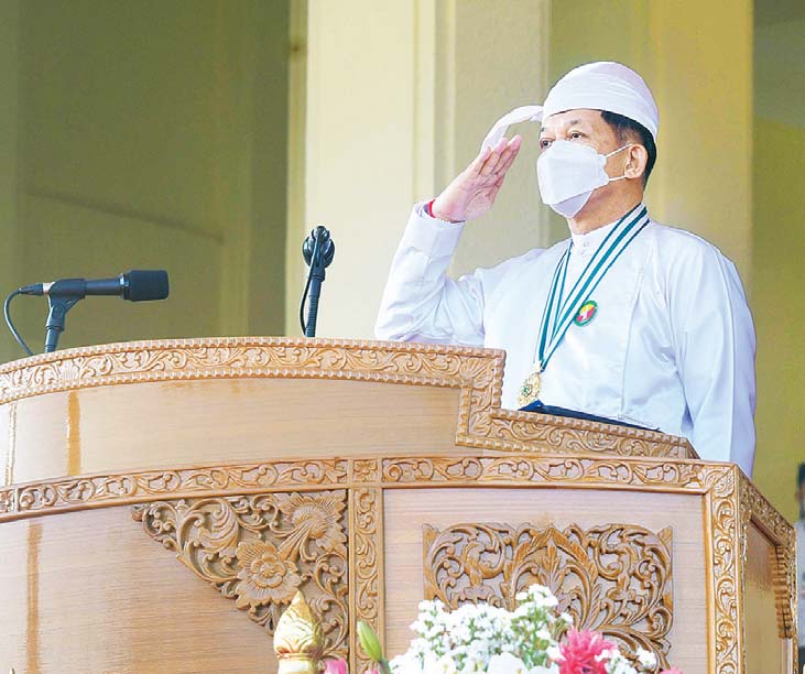 ယင်းနောက် နိုင်ငံတော်စီမံအုပ်ချုပ်ရေးကောင်စီဥက္ကဋ္ဌ နိုင်ငံတော်ဝန်ကြီးချုပ် ဗိုလ်ချုပ်မှူးကြီး မဟာသရေစည်သူ မင်းအောင်လှိုင်ကို တပ်မတော်(ကြည်း) ကိုယ်စားပြုအလံတော်ဖွဲ့၊ တပ်မတော် (ကြည်း) ကိုယ်စားပြုတပ်ခွဲ၊ လွှတ်တော်ကိုယ်စားပြုတပ်ခွဲ၊ ကာကွယ်ရေး ဝန်ကြီးဌာန ကိုယ်စားပြုတပ်ခွဲ၊ ပြည်ထဲရေးဝန်ကြီးဌာန ကိုယ်စားပြုတပ်ခွဲ၊ တပ်မတော်ရေ ကိုယ်စားပြုအလံတော်အဖွဲ့၊ တပ်မတော်(ရေ) ကိုယ်စားပြုတပ်ခွဲ၊ နိုင်ငံခြားရေးဝန်ကြီးဌာန ကိုယ်စားပြုတပ်ခွဲ၊ မြန်မာနိုင်ငံစစ်မှုထမ်းဟောင်းအဖွဲ့ ကိုယ်စားပြုတပ်ခွဲ၊ တပ်မတော်(ကြည်း) စစ်တီးဝိုင်းအဖွဲ့၊ တပ်မတော်(လေ) အလံတော်အဖွဲ့၊ တပ်မတော်(လေ) ကိုယ်စားပြုတပ်ခွဲ၊ နယ်စပ်ရေးရာဝန်ကြီးဌာန ကိုယ်စားပြုတပ်ခွဲ၊ စီမံကိန်းနှင့်ဘဏ္ဍာရေးဝန်ကြီးဌာန ကိုယ်စားပြု တပ်ခွဲ၊ ဥပဒေရေးရာဝန်ကြီးဌာန ကိုယ်စားပြုတပ်ခွဲ၊ မြန်မာနိုင်ငံရဲတပ်ဖွဲ့ အလံတော်အဖွဲ့၊ မြန်မာနိုင်ငံရဲတပ်ဖွဲ့ ကိုယ်စားပြုတပ်ခွဲ၊ ပြန်ကြားရေးဝန်ကြီးဌာန ကိုယ်စားပြုတပ်ခွဲ၊ သာသနာရေးနှင့် ယဉ်ကျေးမှုဝန်ကြီးဌာန ကိုယ်စားပြုတပ်ခွဲ၊ မြန်မာနိုင်ငံရဲတပ်ဖွဲ့ တီးဝိုင်းတပ်ခွဲ၊ မြန်မာနိုင်ငံ မီးသတ်တပ်ဖွဲ့ အလံတော်အဖွဲ့၊ မြန်မာနိုင်ငံမီးသတ်တပ်ဖွဲ့ ကိုယ်စားပြုတပ်ခွဲ၊ စိုက်ပျိုးရေး မွေးမြူရေးနှင့် ဆည်မြောင်းဝန်ကြီးဌာန ကိုယ်စားပြုတပ်ခွဲ၊ သမဝါယမနှင့် ကျေးလက်ဖွံ့ဖြိုးရေး ဝန်ကြီးဌာန ကိုယ်စားပြုတပ်ခွဲ၊ ပို့ဆောင်ရေးနှင့် ဆက်သွယ်ရေး ဝန်ကြီးဌာန ကိုယ်စားပြုတပ်ခွဲ၊ စီမံကိန်းနှင့်ဘဏ္ဍာရေး ဝန်ကြီးဌာန ကိုယ်စားပြုအလံတော်အဖွဲ့၊ လူဝင်မှုကြီးကြပ်ရေးနှင့် ပြည်သူ့အင်အား ဝန်ကြီးဌာန ကိုယ်စားပြုတပ်ခွဲ၊ သယံဇာတနှင့် သဘာဝပတ်ဝန်းကျင် ထိန်းသိမ်းရေးဝန်ကြီးဌာန ကိုယ်စားပြုတပ်ခွဲ၊ လျှပ်စစ်နှင့်စွမ်းအင် ဝန်ကြီးဌာန ကိုယ်စားပြုတပ်ခွဲ၊ မြန်မာနိုင်ငံမီးသတ်တပ်ဖွဲ့တီးဝိုင်း၊ ပို့ဆောင်ရေးနှင့် ဆက်သွယ်ရေးဝန်ကြီးဌာန အလံတော်အဖွဲ့၊ စက်မှုဝန်ကြီးဌာန ကိုယ်စားပြုတပ်ခွဲ၊ အလုပ်သမား ဝန်ကြီးဌာန ကိုယ်စားပြုတပ်ခွဲ၊ စီးပွားရေးနှင့် ကူးသန်းရောင်းဝယ်ရေး ဝန်ကြီးဌာနကိုယ်စားပြု တပ်ခွဲ၊ ပညာရေးဝန်ကြီးဌာန ကိုယ်စားပြုတပ်ခွဲ၊ သယံဇာတနှင့် သဘာဝပတ်ဝန်းကျင် ထိန်းသိမ်းရေးဝန်ကြီးဌာန အလံတော်အဖွဲ့၊ ကျန်းမာရေးဝန်ကြီးဌာန ကိုယ်စားပြုတပ်ခွဲ၊ သိပ္ပံနှင့်နည်းပညာ ဝန်ကြီးဌာန ကိုယ်စားပြုတပ်ခွဲ၊ အားကစားနှင့်လူငယ်ရေးရာ ဝန်ကြီးဌာန ကိုယ်စားပြုတပ်ခွဲ၊ အ.ထ.က(၁)ကျောင်းသား၊ ကျောင်းသူများ၏ ဘင်ခရာအဖွဲ့၊ ဆောက်လုပ်ရေးဝန်ကြီး ဌာန အလံတော်အဖွဲ့၊ ဆောက်လုပ်ရေးဝန်ကြီးဌာန ကိုယ်စားပြုတပ်ခွဲ၊ လူမှုဝန်ထမ်း ကယ်ဆယ်ရေးနှင့် ပြန်လည်နေရ