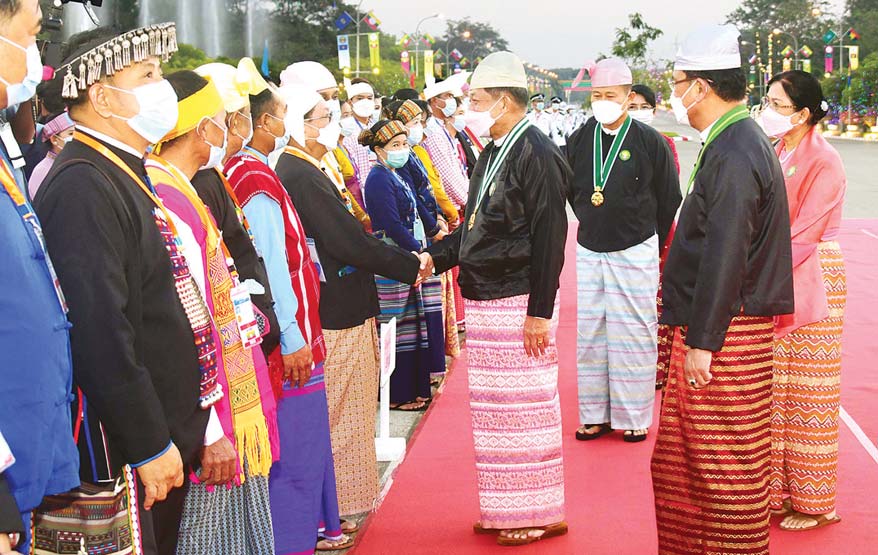 ဖျော်ဖြေတင်ဆက်မှုများအပြီးတွင် နိုင်ငံတော်စီမံအုပ်ချုပ်ရေးကောင်စီဥက္ကဋ္ဌ နိုင်ငံတော် ဝန်ကြီးချုပ် ဗိုလ်ချုပ်မှူးကြီး မဟာသရေစည်သူ မင်းအောင်လှိုင်နှင့်ဇနီး ဒေါ်ကြူကြူလှတို့သည် ၂၀၂၂ ခုနှစ် (၇၅) နှစ်မြောက် စိန်ရတုပြည်ထောင်စုနေ့ အခမ်းအနားတွင် ကပြဖျော် ဖြေခဲ့ကြသည့် တိုင်းရင်းသားရိုးရာယဉ်ကျေးမှုအဖွဲ့ဝင်များကို ရင်းရင်းနှီးနှီး နှုတ်ဆက်ကြသည်။